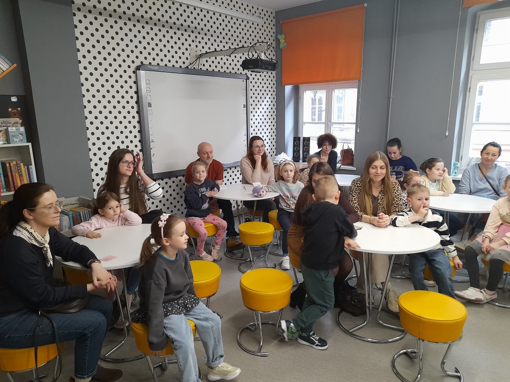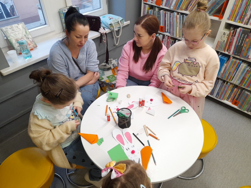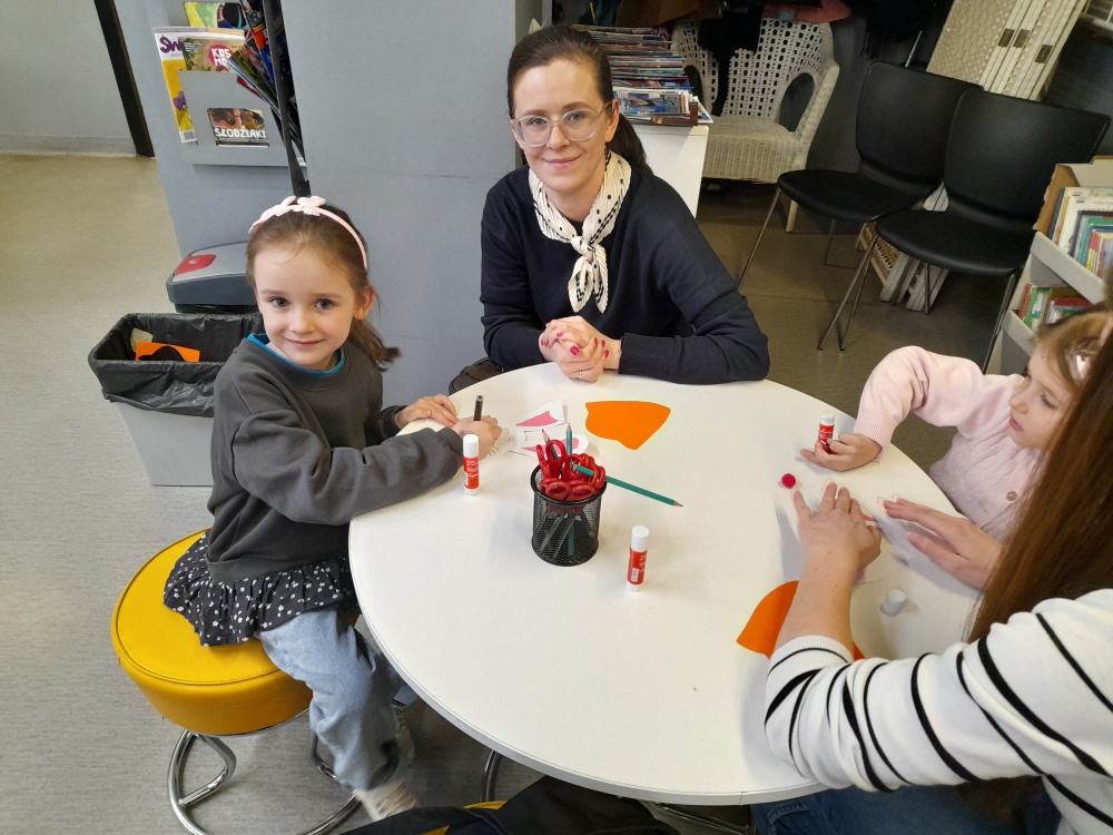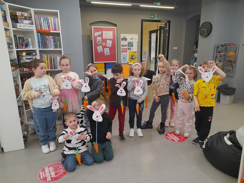 Po lekturze dzieci chętnie dzieliły się swoimi doświadczeniami, opowiadając o sytuacjach, gdy gromadzą zbyt wiele zabawek, oraz zastanawiały się, co można zrobić z ich nadmiarem. Spotkanie wprowadziło również uczestników w nastrój zbliżających się Świąt Wielkanocnych. Zwieńczeniem zajęć była praca plastyczna - papierowy zajączek z marchewkową kieszonką na kolorowe jajeczko, która sprawiła dzieciom wiele radości.