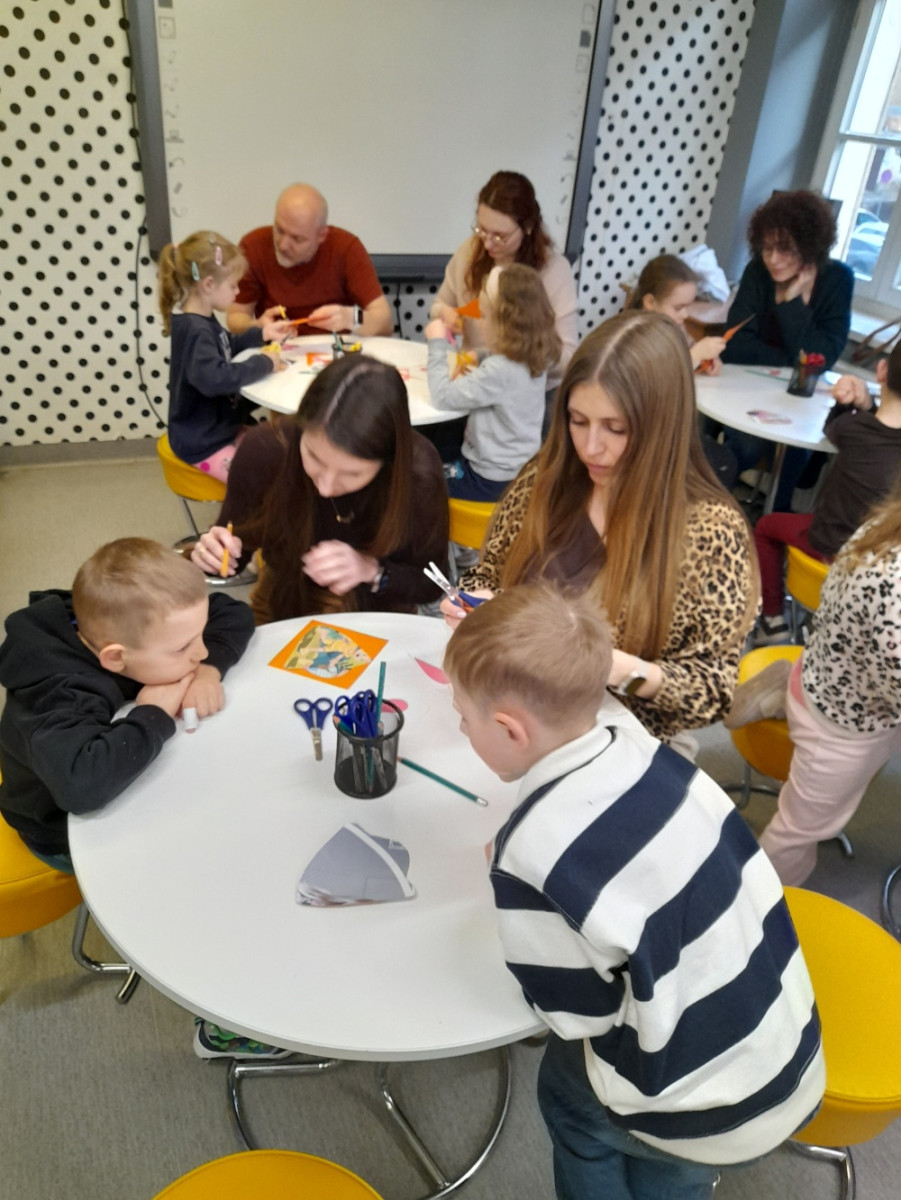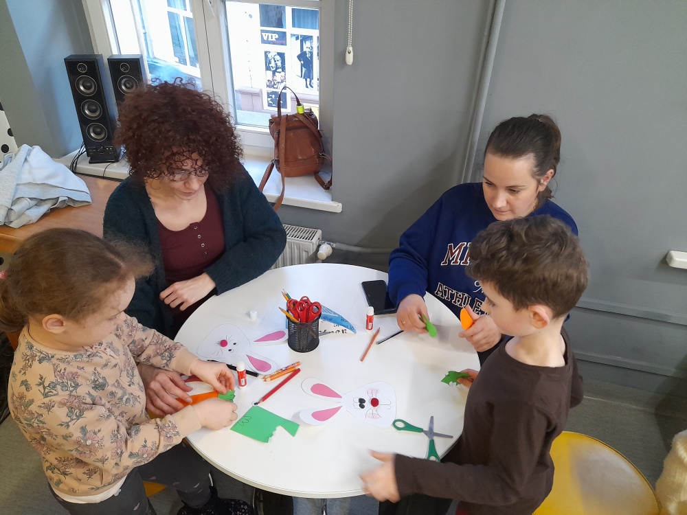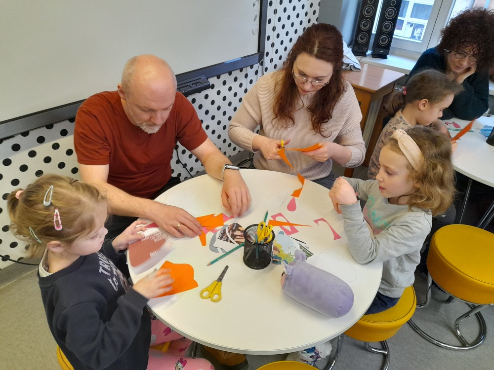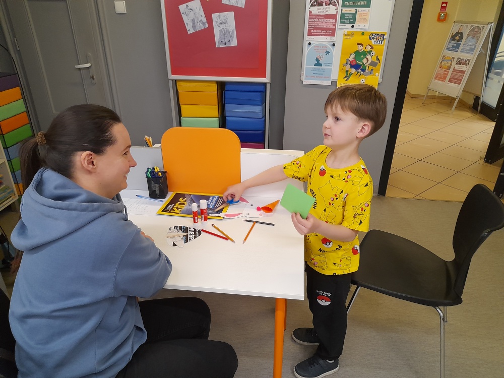 Po lekturze dzieci chętnie dzieliły się swoimi doświadczeniami, opowiadając o sytuacjach, gdy gromadzą zbyt wiele zabawek, oraz zastanawiały się, co można zrobić z ich nadmiarem. Spotkanie wprowadziło również uczestników w nastrój zbliżających się Świąt Wielkanocnych. Zwieńczeniem zajęć była praca plastyczna - papierowy zajączek z marchewkową kieszonką na kolorowe jajeczko, która sprawiła dzieciom wiele radości.