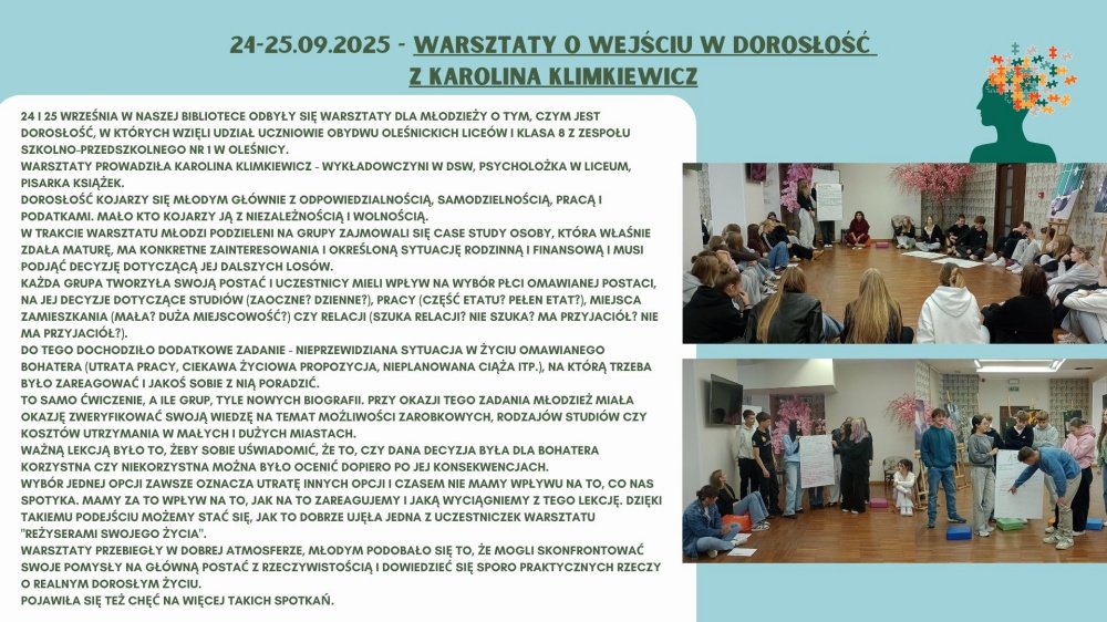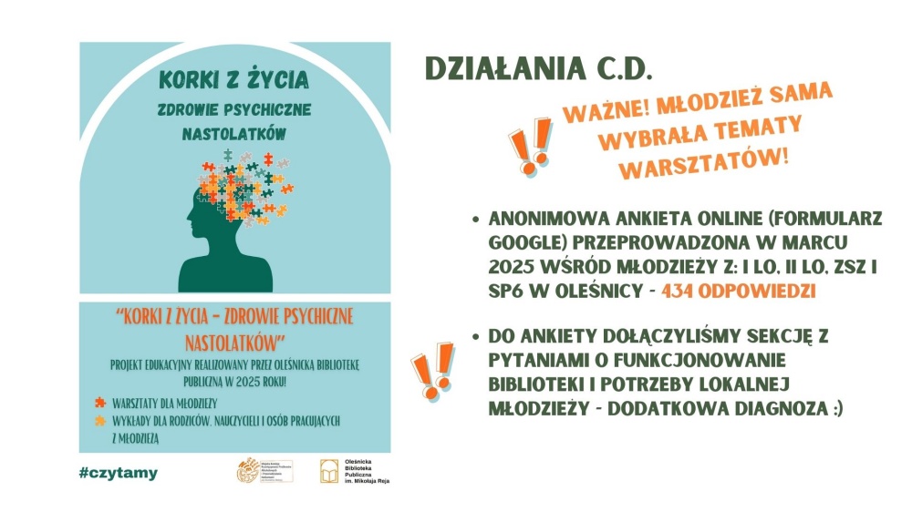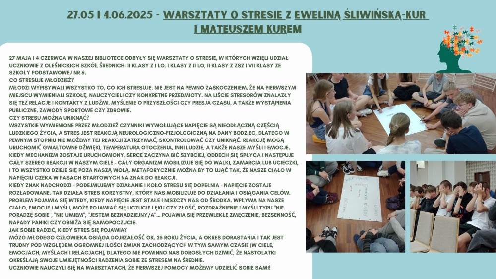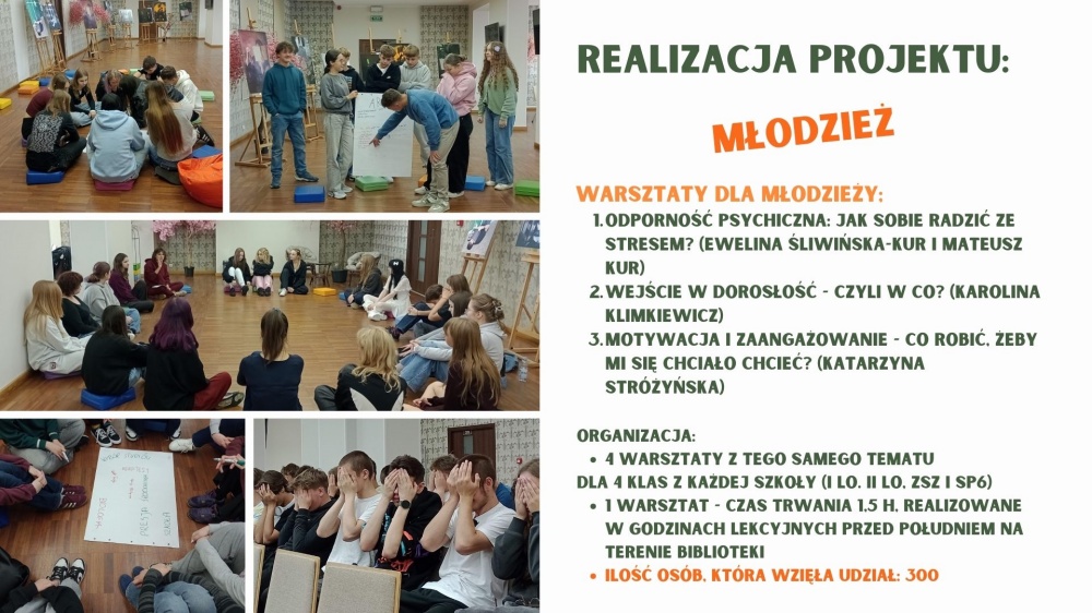 W ramach projektu zorganizowaliśmy warsztaty dla uczniów z oleśnickich szkół średnich i podstawowych i wykłady dla dorosłych. Dla młodzieży odbyło się łącznie 12 warsztatów, w których wzięło udział 300 osób. Tematy warsztatów zostały wybrane przez uczniów w anonimowej ankiecie i dotyczyły takich zagadnień, jak: stres, wejście w dorosłość, motywacja i zaangażowanie.