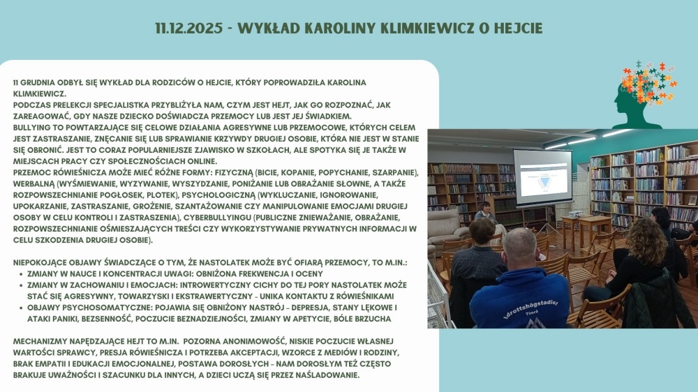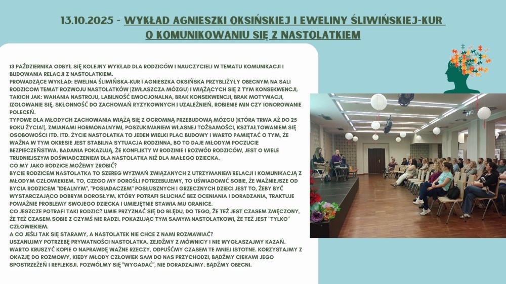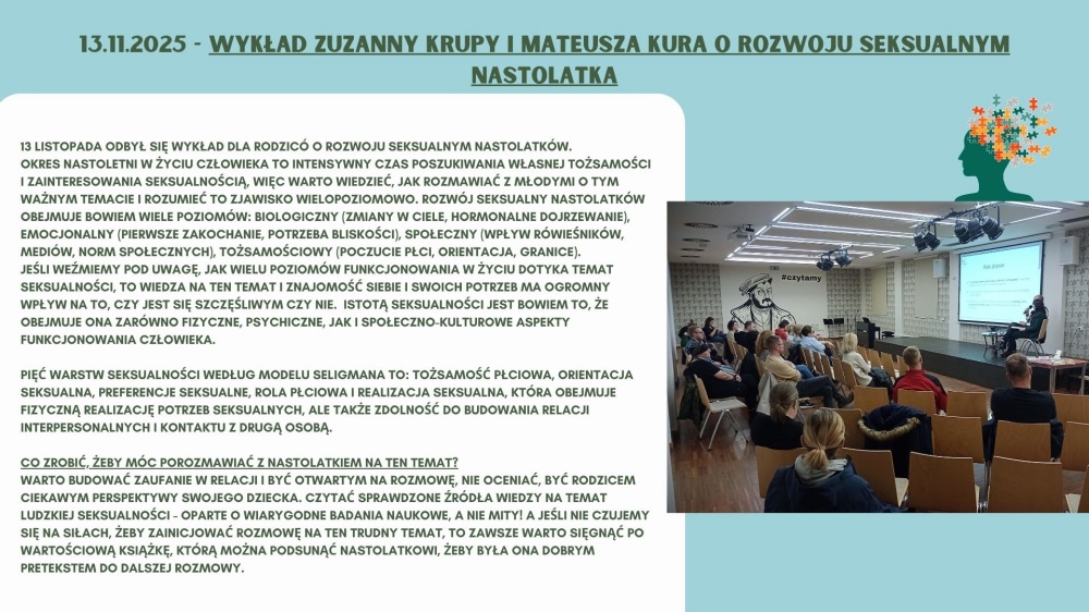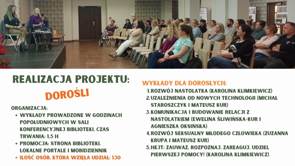 Dla dorosłych odbyło się 5 wykładów, w których wzięło udział 130 osób. Tematy wykładów to m.in. rozwój nastolatka, w tym rozwój seksualny, uzależnienia od nowych technologii, hejt czy komunikacja z młodym człowiekiem.