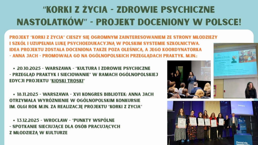 21 Stycznia 2026W 2025 roku nasza biblioteka zrealizowała pilotażowy projekt edukacyjny "Korki z Życia - zdrowie psychiczne nastolatków". Celem projektu była psychoedukacja młodzieży i dorosłych i pokazanie biblioteki jako miejsca inspiracji i zdobywania wartościowej wiedzy.