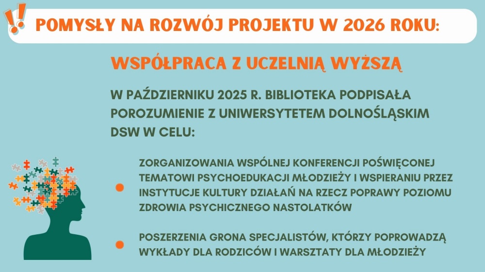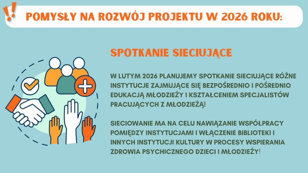 W lutym 2026 roku planujemy spotkanie sieciujące różne instytucje z miasta i powiatu zajmujące się bezpośrednio i pośrednio edukacją młodzieży, a także wsparciem psychoterapeutycznym osób w kryzysie zdrowia psychicznego. Sieciowanie ma na celu nawiązanie współpracy pomiędzy instytucjami i włączenie biblioteki i innych instytucji kultury w procesy wspierania zdrowia psychicznego mieszkańców (szczególnie dzieci i młodzieży).
