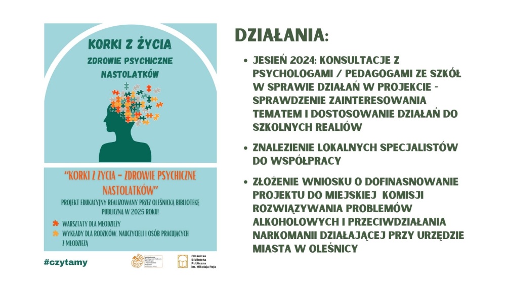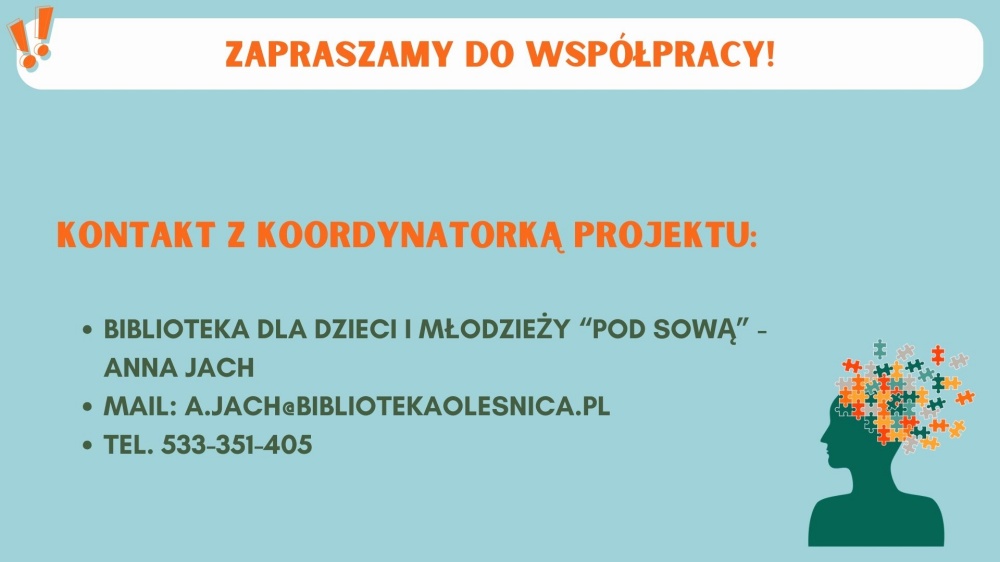 Nasza biblioteka otwarta jest na współpracę z mieszkańcami w zakresie wspólnego dbania o zdrowie psychiczne Oleśniczan. Szukamy zarówno doświadczonych specjalistów, jak i wolontariuszy, którzy wesprą nas w realizacji projektu. Osoby zainteresowane współpracą zapraszamy do kontaktu z koordynatorką "Korków z Życia" - Anną Jach: