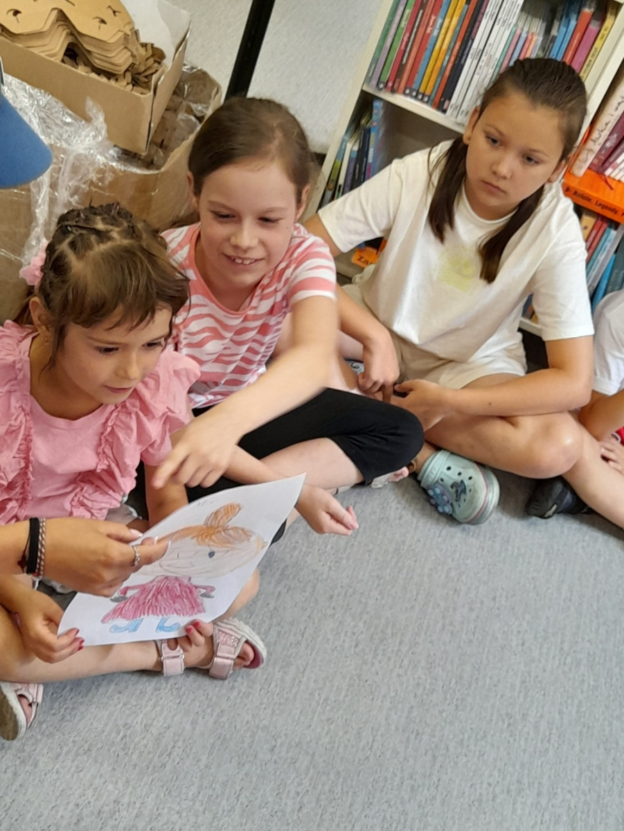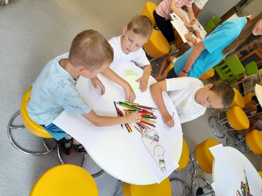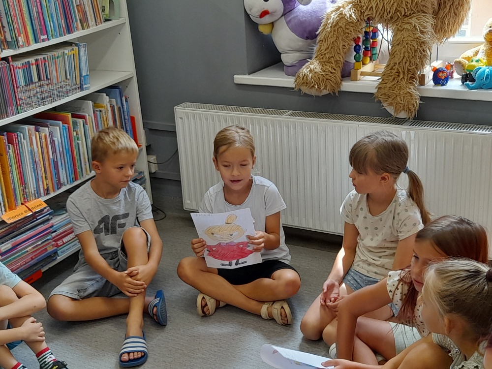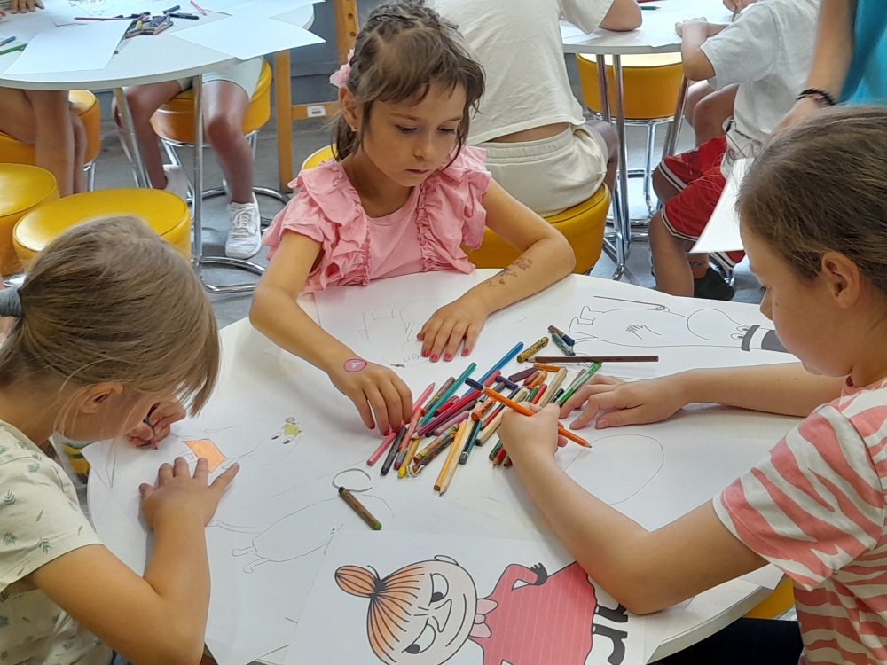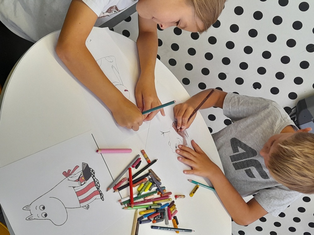 Nie zabrakło również twórczej części warsztatów. Mali uczestnicy mieli za zadanie narysować jednego z bohaterów opowiadań o Muminkach lub, puścić wodze fantazji, stworzyć własną postać, która mogłaby zamieszkać obok Muminków. Każde dziecko chętnie prezentowało swój rysunek i opowiadało historię wymyślonej postaci, nie brakowało ciekawych pomysłów i barwnych opisów.