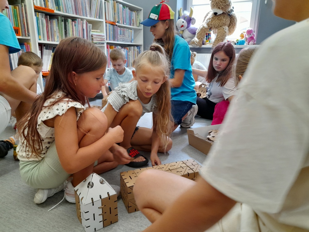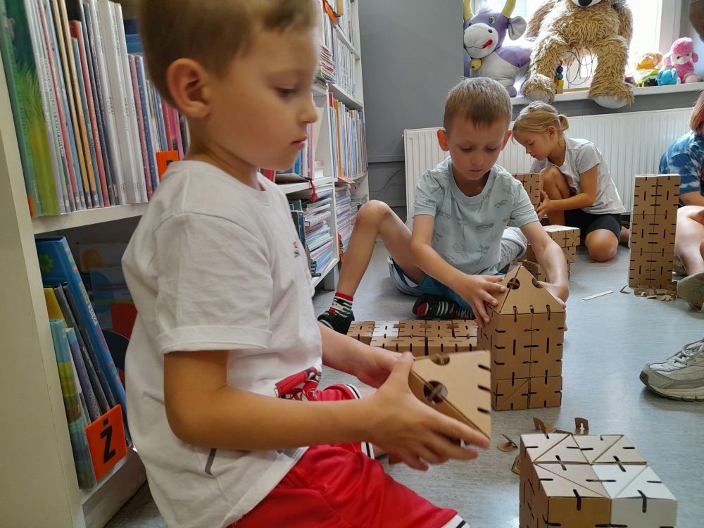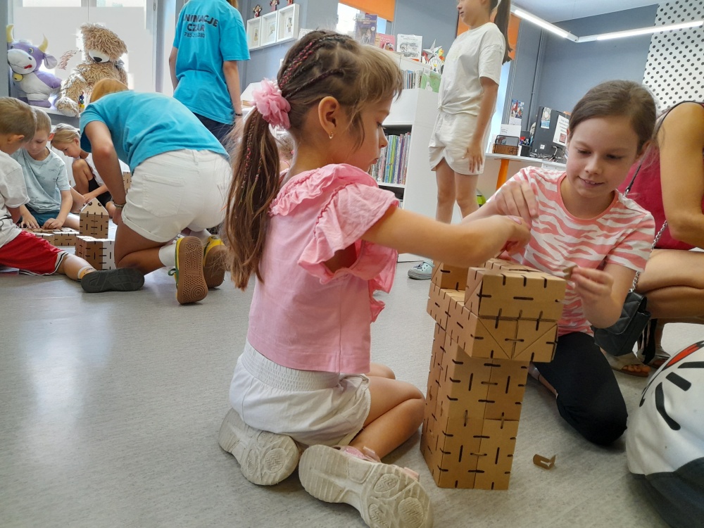 Kolejnym punktem programu było wspólne budowanie krainy Muminków. Z pomocą tekturowych elementów i wskazówek animatorek dzieci tworzyły domki dla Muminka i jego przyjaciół, dzięki czemu Dolina Muminków nabierała kształtów tuż przed oczami uczestników.