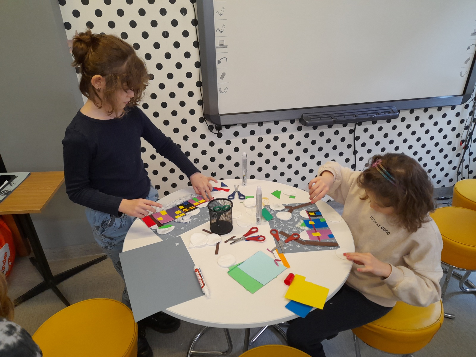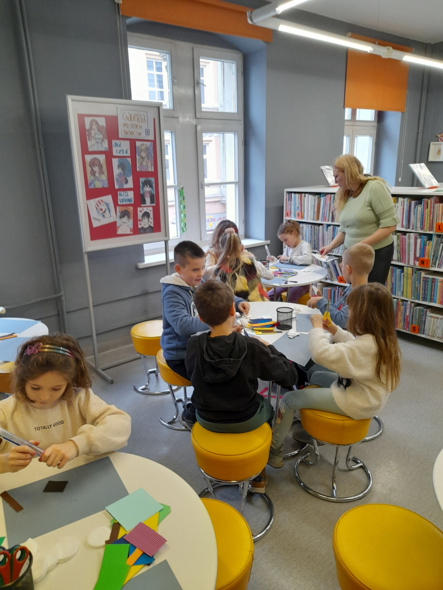Tym razem, pani Iryna zaprosiła do stworzenia zimowego, miejskiego krajobrazu. Chociaż po porannym śniegu nie zostało śladu, dzieci z zapałem wyklejały ośnieżone domy i z dbałością o szczegóły, komponowały swoje papierowe miasteczka w zimowej odsłonie. Każde z dzieci zabrało swoją pracę do domu, żeby przypominała kreatywnie spędzony czas w Bibliotece "Pod Sową".