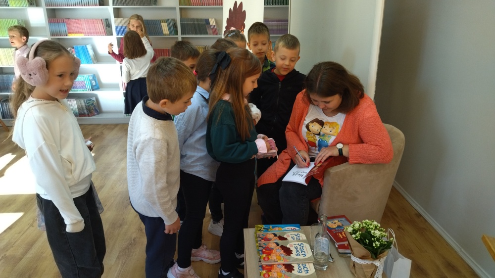 Pani Monika bardzo zachęcała dzieci do pisania do specjalnej teczki, nawet powiedziała od czego zacząć, jak zbierać pomysły, żeby pisać na początek naprawdę krótkie teksty, które w każdej chwili można rozbudować. Na zakończenie tego ciekawego spotkania autorka podpisywała swoje książki, rozdając autografy uczniom.