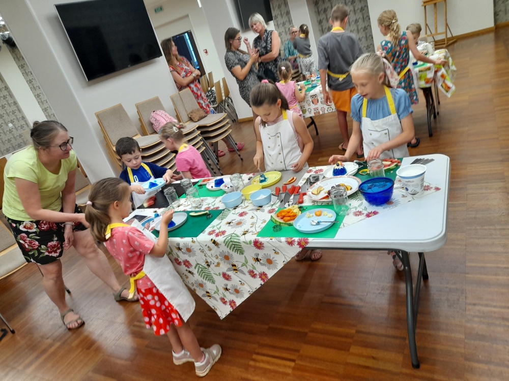 Była okazja do nauki obsługi robota kuchennego, oczywiście pod opieką pani Beaty oraz do mieszania skyru z niebieską spiruliną do deseru Olafa. Błękitne, chłodne, borówkowe galaretki, w kształcie babeczek, ozdobiono zdrowym kremem i mnóstwem fantazyjnie wyciętych owoców.