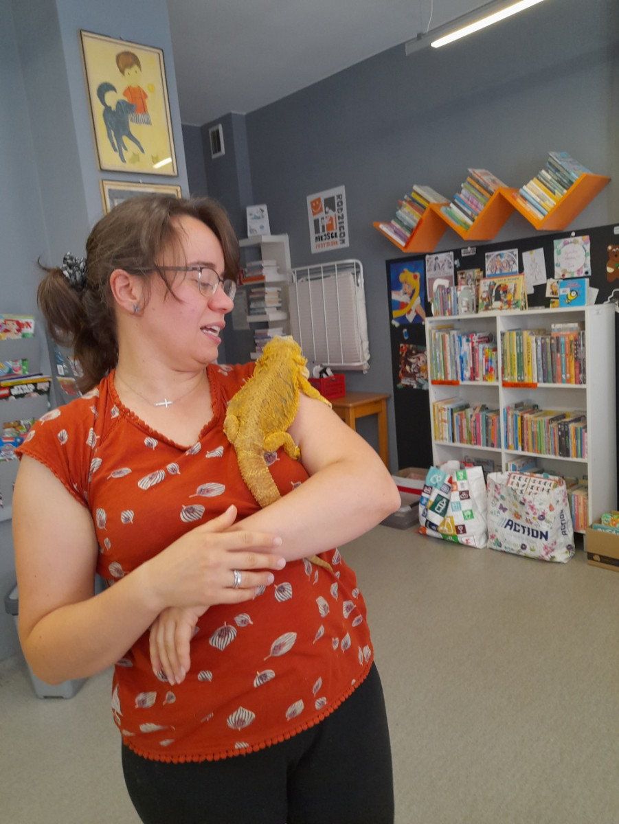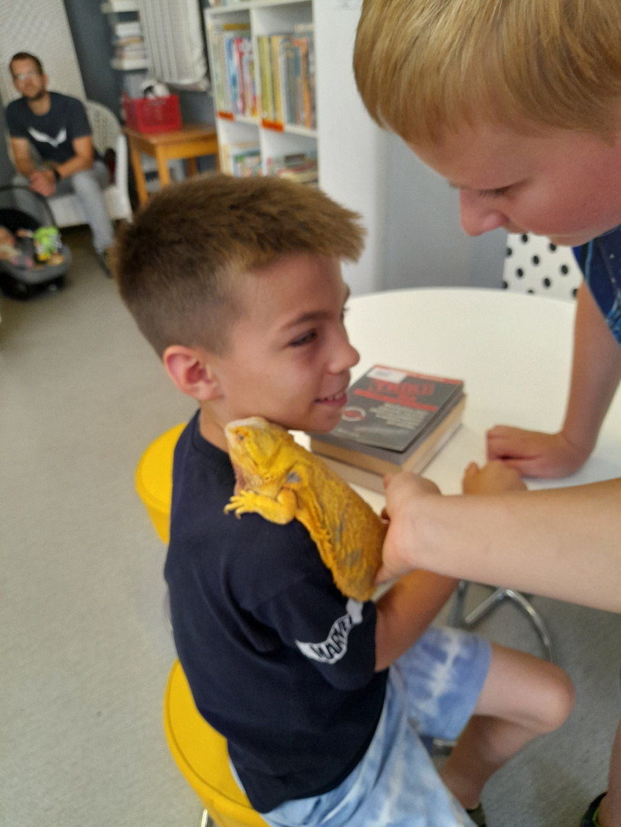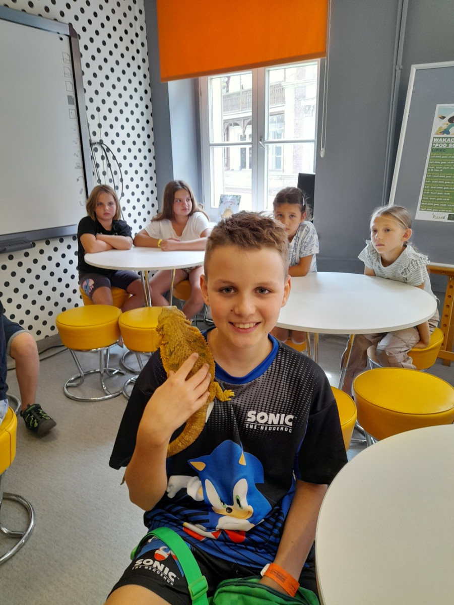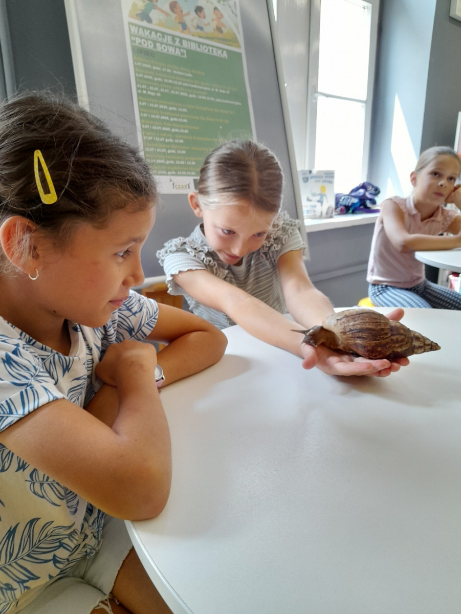 Uczestnicy warsztatów mieli niepowtarzalną okazję zobaczyć z bliska, a nawet dotknąć żywych stworzeń – wśród nich znalazły się m.in. ślimak afrykański, agama brodata, patyczaki, stonogi, a także kokony motyli. Każde z tych zwierząt wzbudzało ogromne zainteresowanie, a dzieci z zaciekawieniem słuchały opowieści pani Kamili o ich zwyczajach, emocjach i sposobach porozumiewania się.