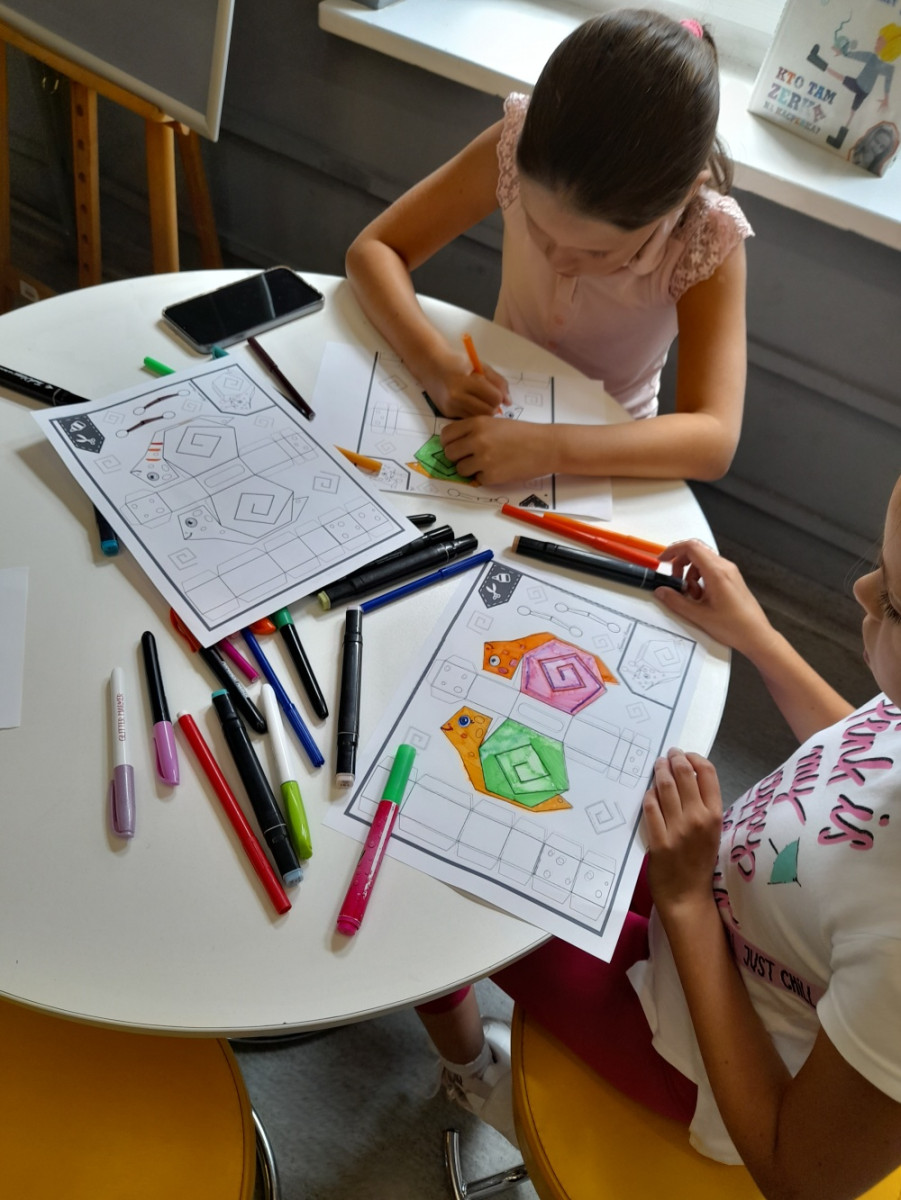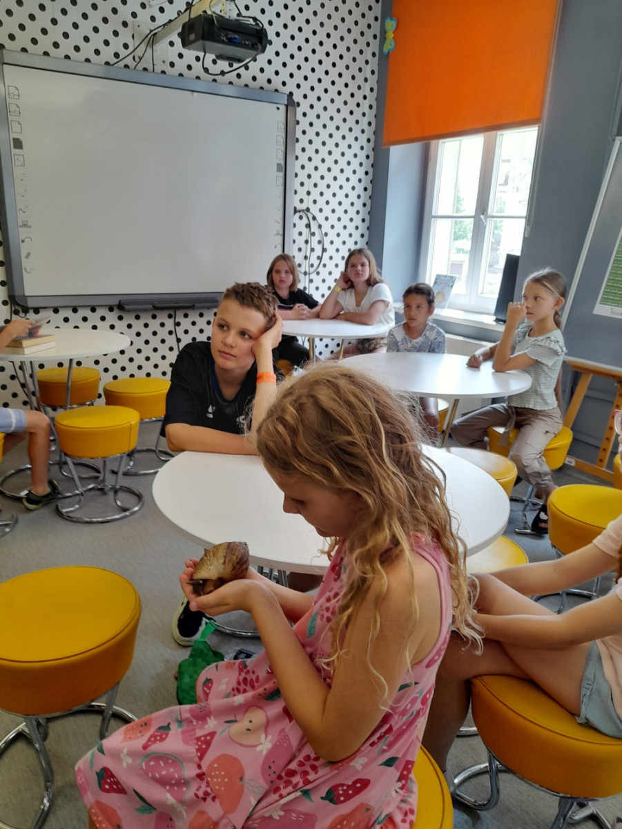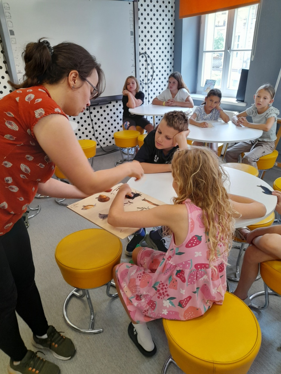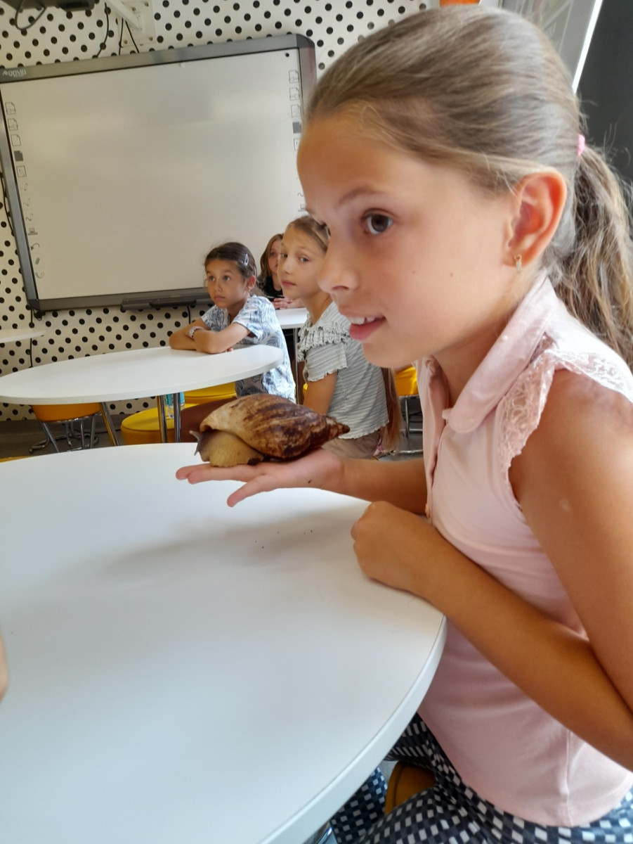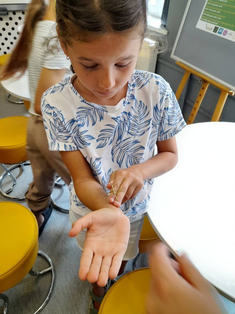 Uczestnicy warsztatów mieli niepowtarzalną okazję zobaczyć z bliska, a nawet dotknąć żywych stworzeń – wśród nich znalazły się m.in. ślimak afrykański, agama brodata, patyczaki, stonogi, a także kokony motyli. Każde z tych zwierząt wzbudzało ogromne zainteresowanie, a dzieci z zaciekawieniem słuchały opowieści pani Kamili o ich zwyczajach, emocjach i sposobach porozumiewania się.