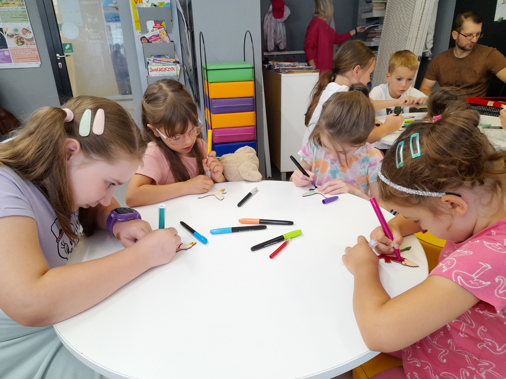 Na zakończenie zajęć, młodzi przyrodnicy mieli okazję wyrazić swoją kreatywność, kolorując drewniane zawieszki przedstawiające ptaki. Każda zawieszka była unikalna i odzwierciedlała wyobraźnię oraz indywidualne pomysły dzieci.