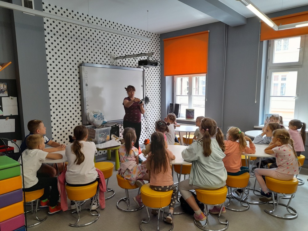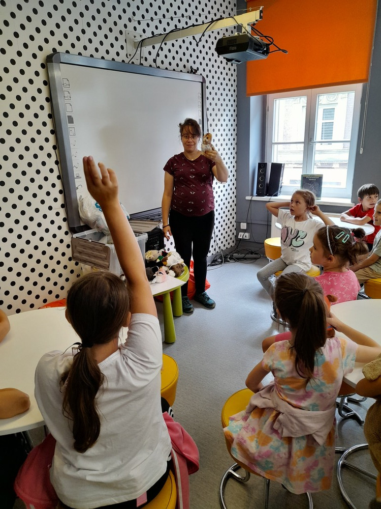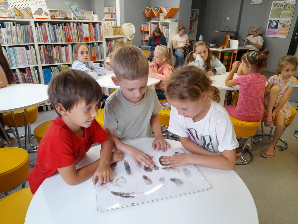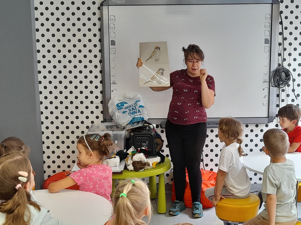 5 Lipca 2024W czwartek 4 lipca, na kolejnych zajęciach z cyklu „Tropami przyrody”, dzieci miały okazję poznać ptaki występujące w Polsce. Pani Kamila i pan Piotr rozpoczęli od zabawy, w której dzieci odgadywały nazwy ptaków na podstawie maskotek wydających charakterystyczne dźwięki.