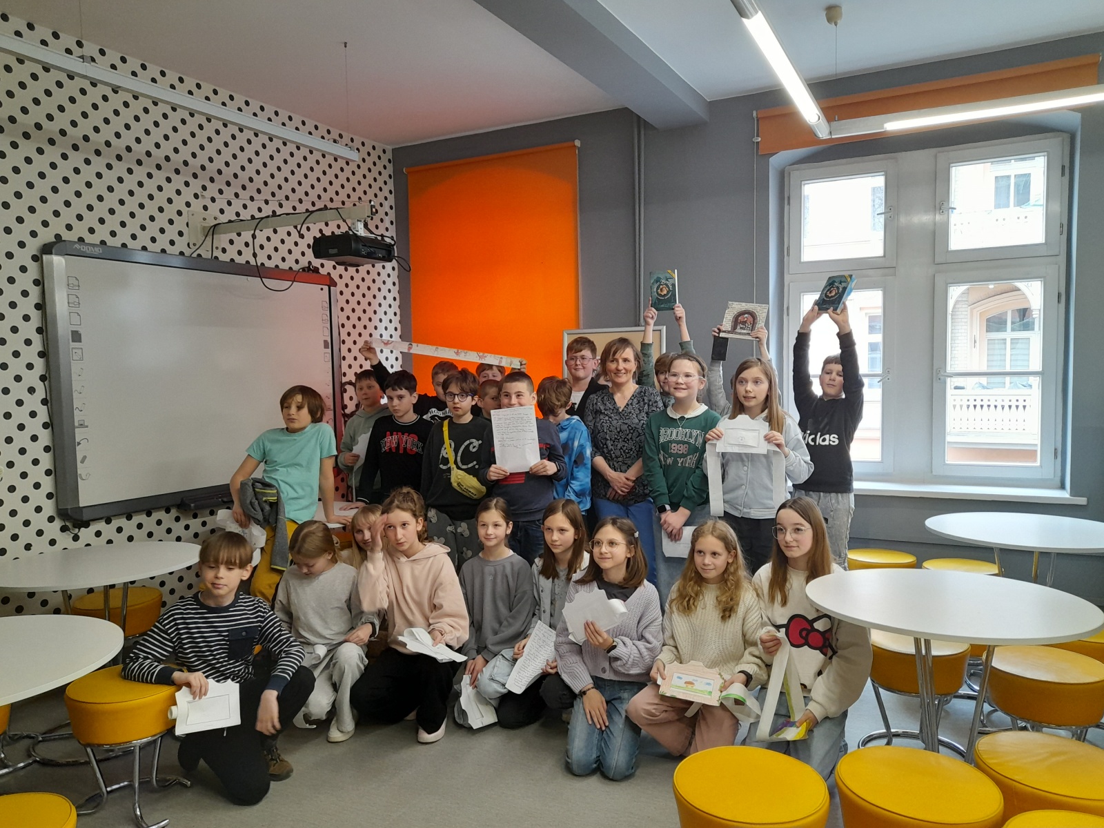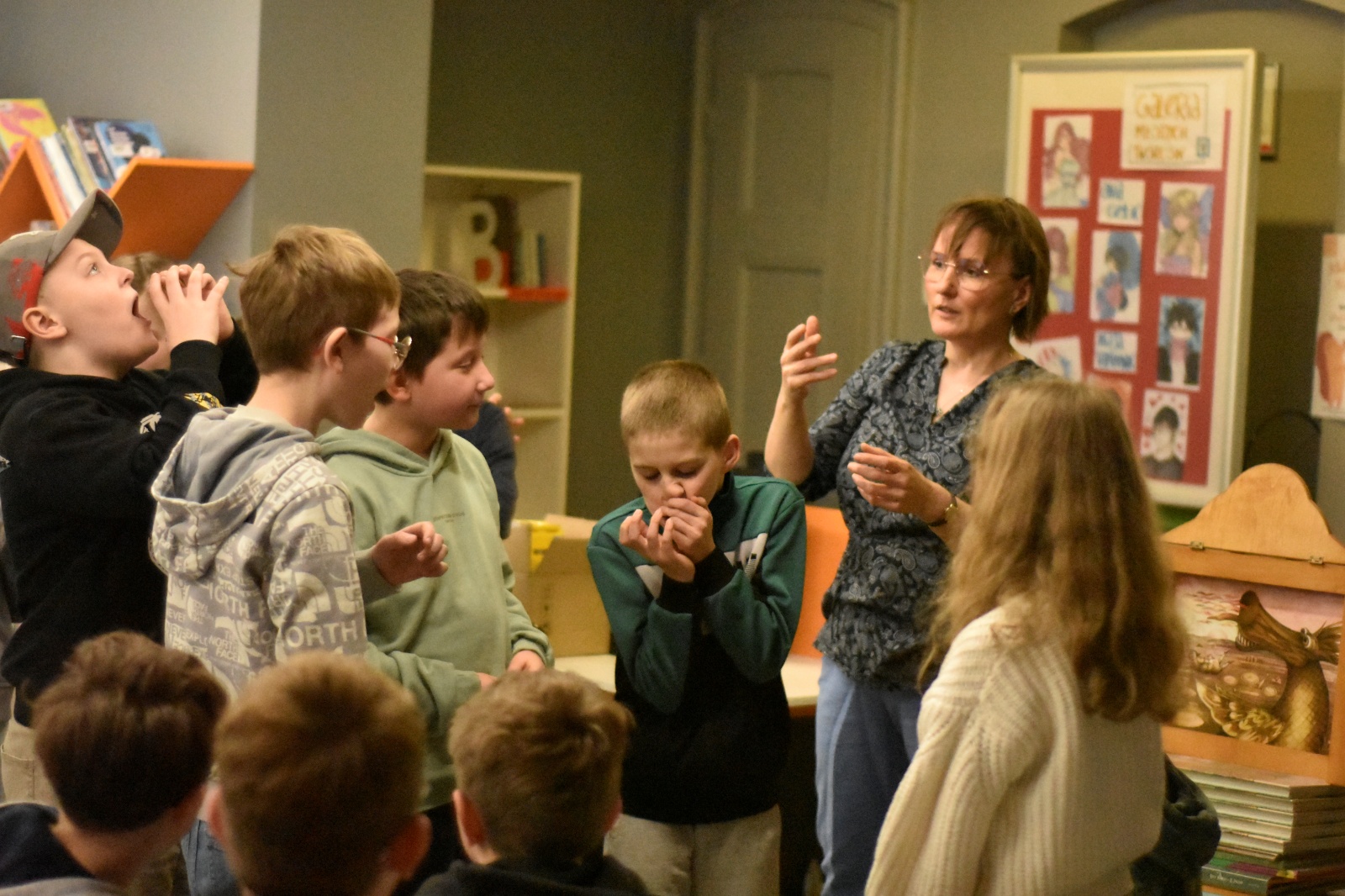 Uczniowie z klasy 4b Szkoły Podstawowej nr 4 w Oleśnicy mieli okazję wysłuchać i obejrzeć spektakl o smoku wawelskim, a potem pobawić się pantomimą, przygotować scenki bez użycia słów, a na końcu wymyślić własną fabułę do teatrzyku kamishibai.