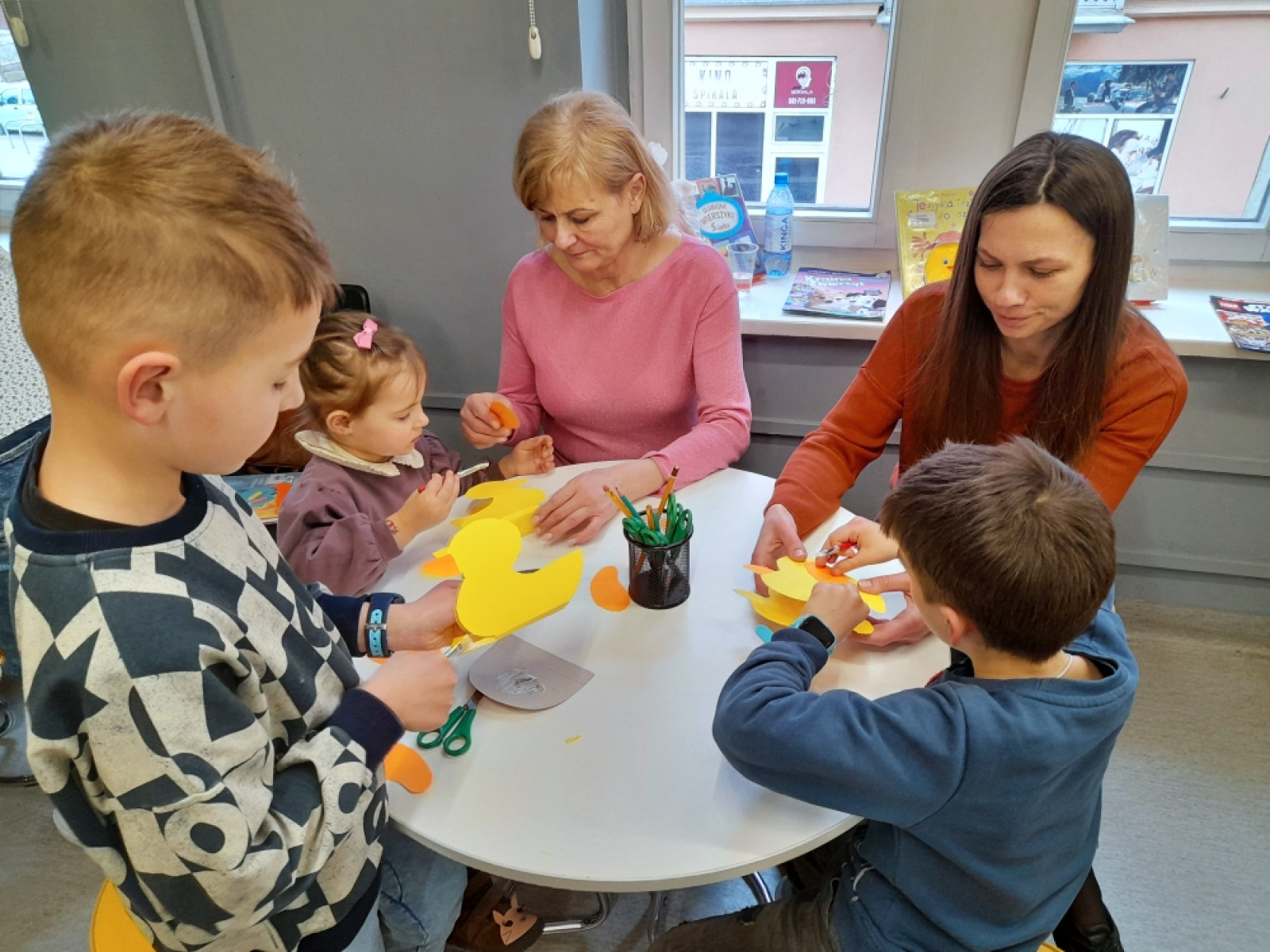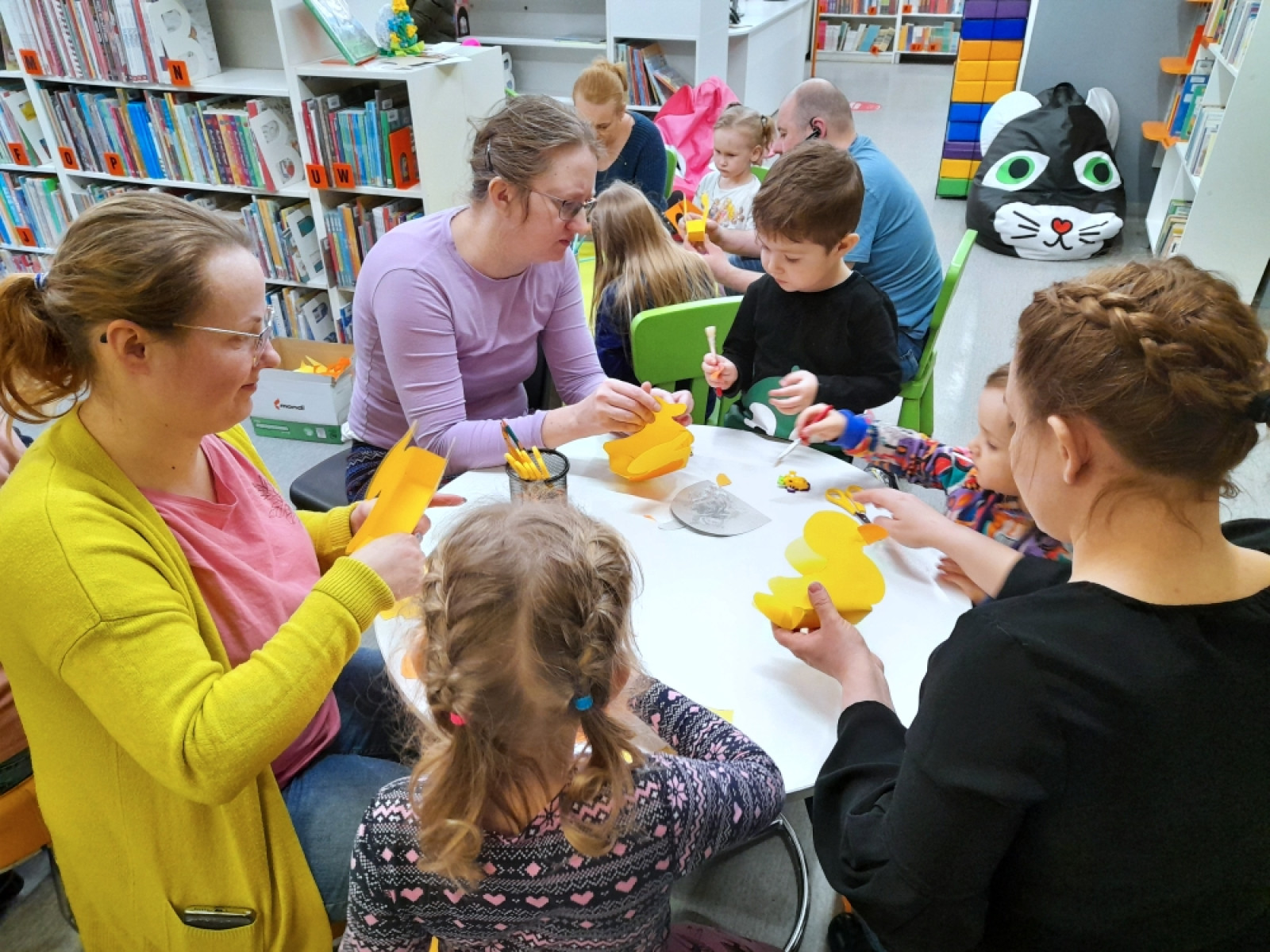 Na zakończenie spotkania z kolorowego papieru dzieci wykonały kaczuszkę - pudełko na słodkości wielkanocne.