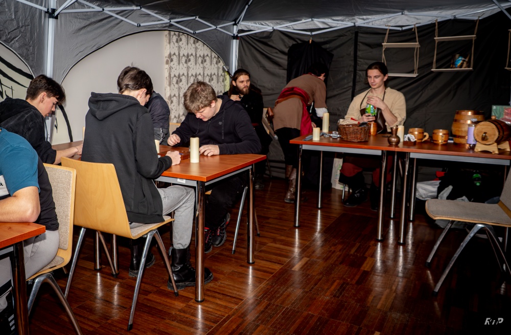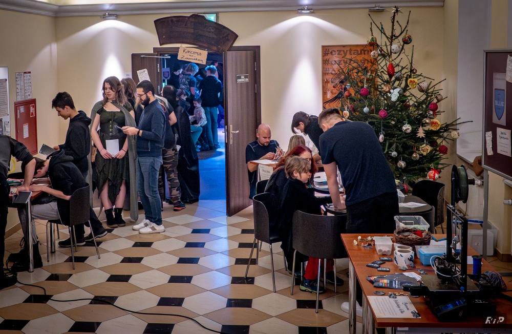 Dźwięk Kowalskiego młota pod biblioteką rozpoczął imprezę, a gwar rozmów przy partyjce Gwinta czy kościanego pokera przeplatał się z muzyką na żywo. Strefa gier planszowych i RPG przeplatała się z nowymi technologiami: grami z prądem i drukiem 3D. Uczestnicy mogli wziąć udział w grze fabularnej i zdobyć Wiedźmiński medalion, odwiedzając przy okazji wszystkie stanowiska. Były quizy wiedzy o uniwersum, a także konkurs na najlepsze przebranie. Głód można było zaspokoić pajdą chleba ze smalcem. A dodatkową atrakcją były dyby, w które można się było zakuć i zrobić pamiątkowe zdjęcie.