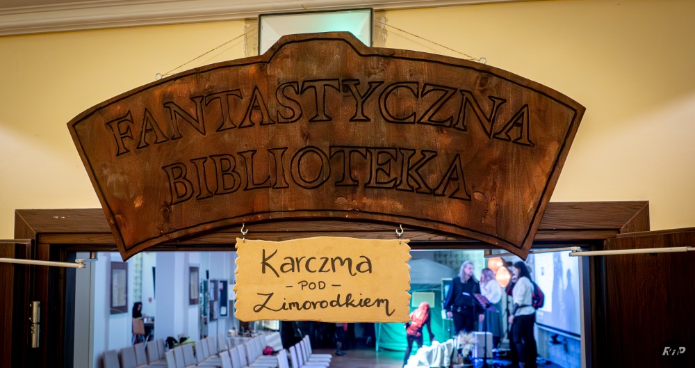 Przy wejściu do sali powitał ich szyld specjalnie zrobiony na to wydarzenie, bo wszystkie wydarzenia chcemy, żeby odbywały się w ramach spójnego cyklu Fantastyczna Biblioteka.
