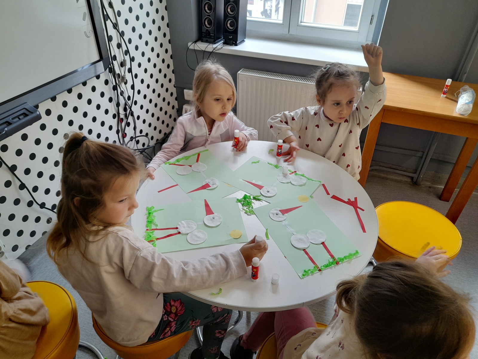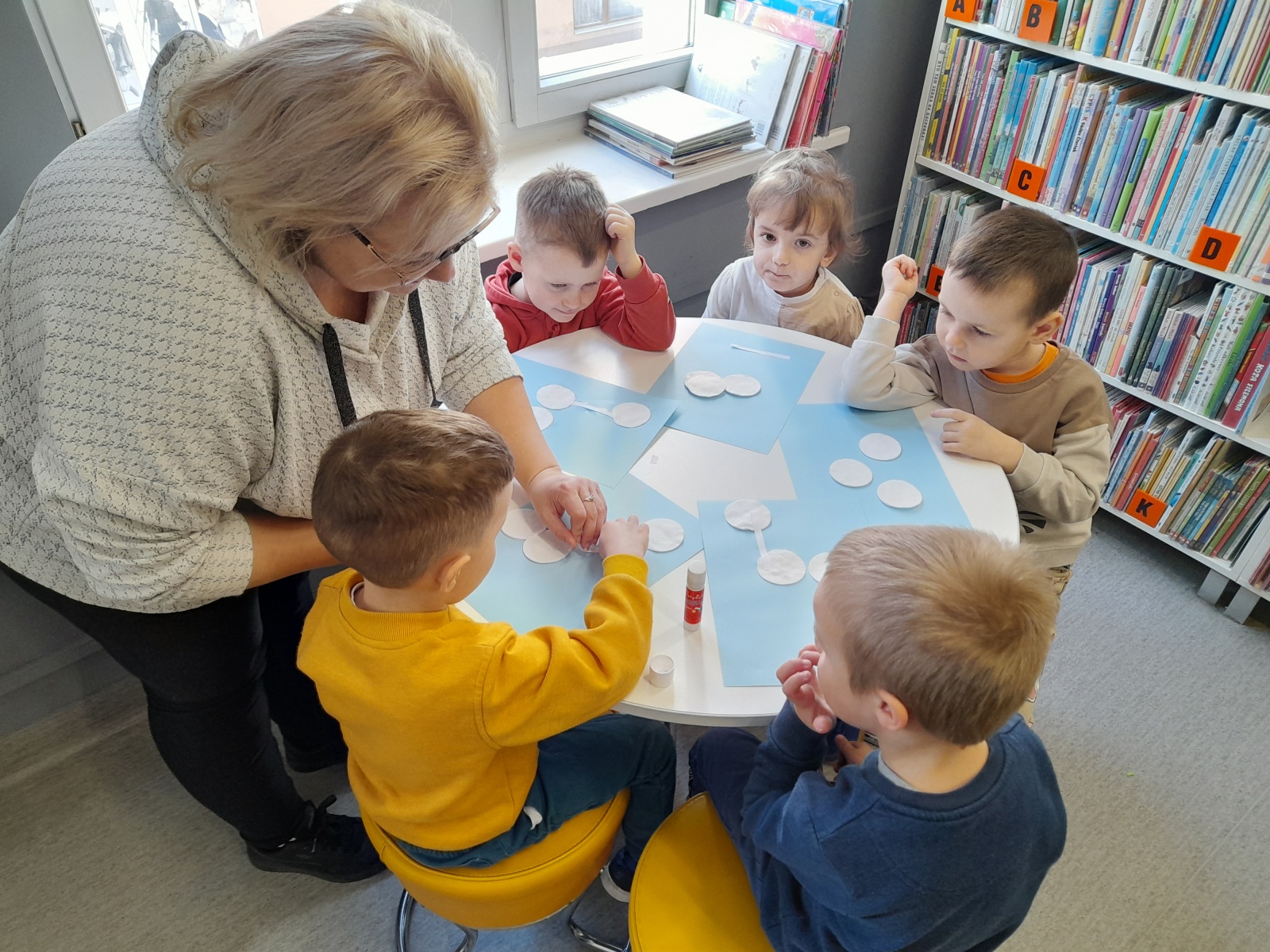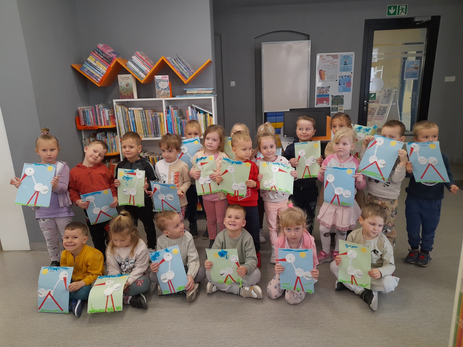Tej wiosennej wizycie towarzyszyły wspaniałe humory i uśmiechy. Nie zabrakło także wesołej piosenki o maszerującej Wiośnie, którą przedszkolaki zaśpiewały podczas bibliotecznych zajęć. Bohaterem zajęć był bocian biały. Dzieci poznały jego zwyczaje, metody budowy gniazd i upodobania żywieniowe. Potem odszukiwały jego wizerunek w atlasach i książkach przyrodniczych. Zwieńczeniem zajęć była papierowa praca plastyczna - "Bocian biały na łące" i wspólne zdjęcie całej grupy.