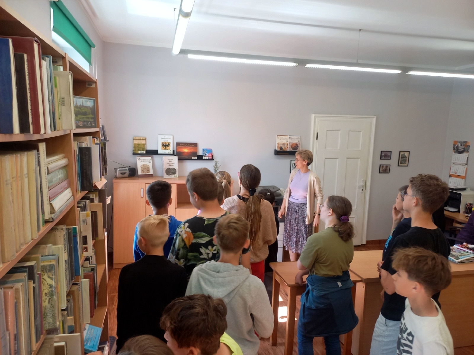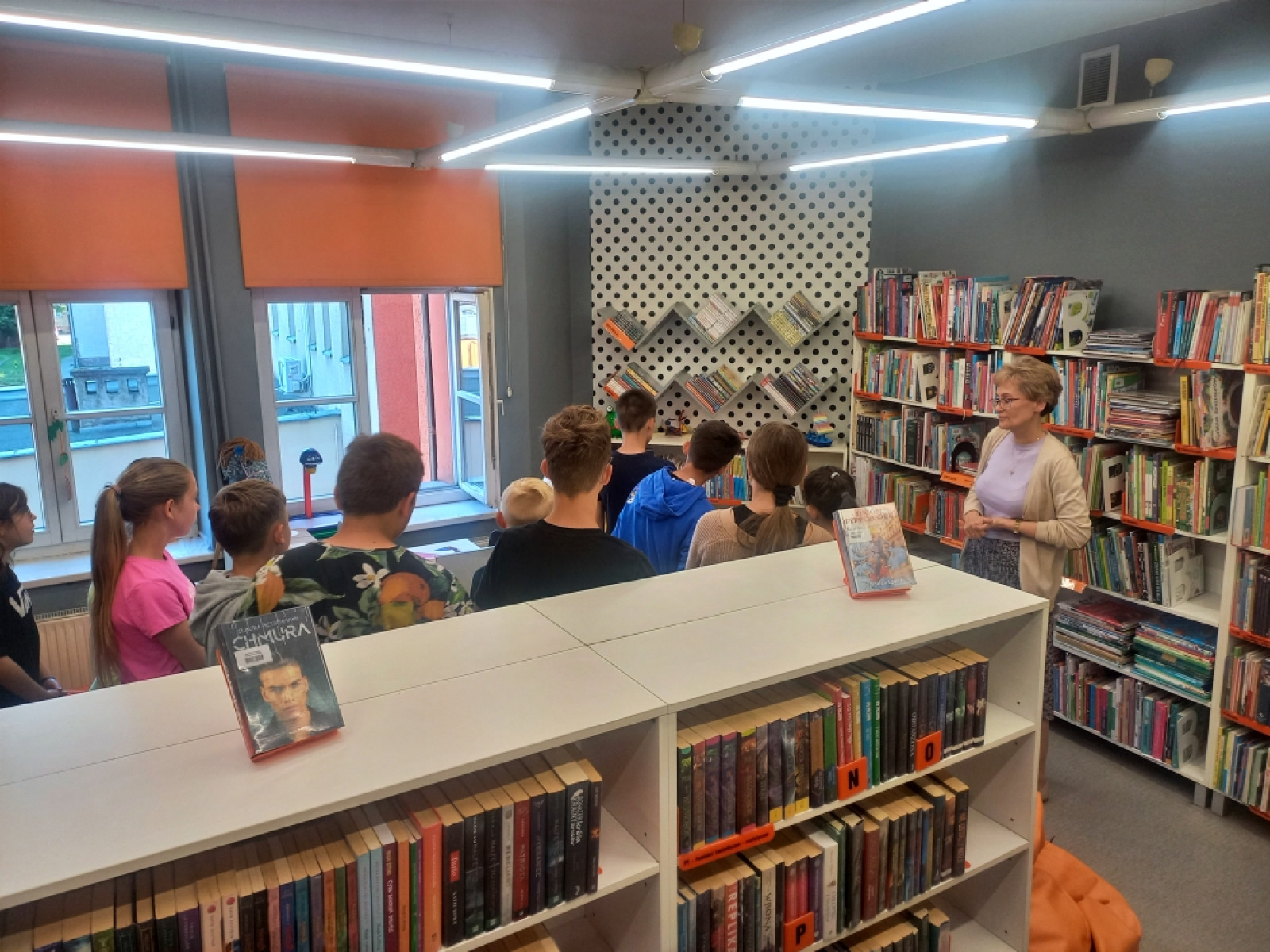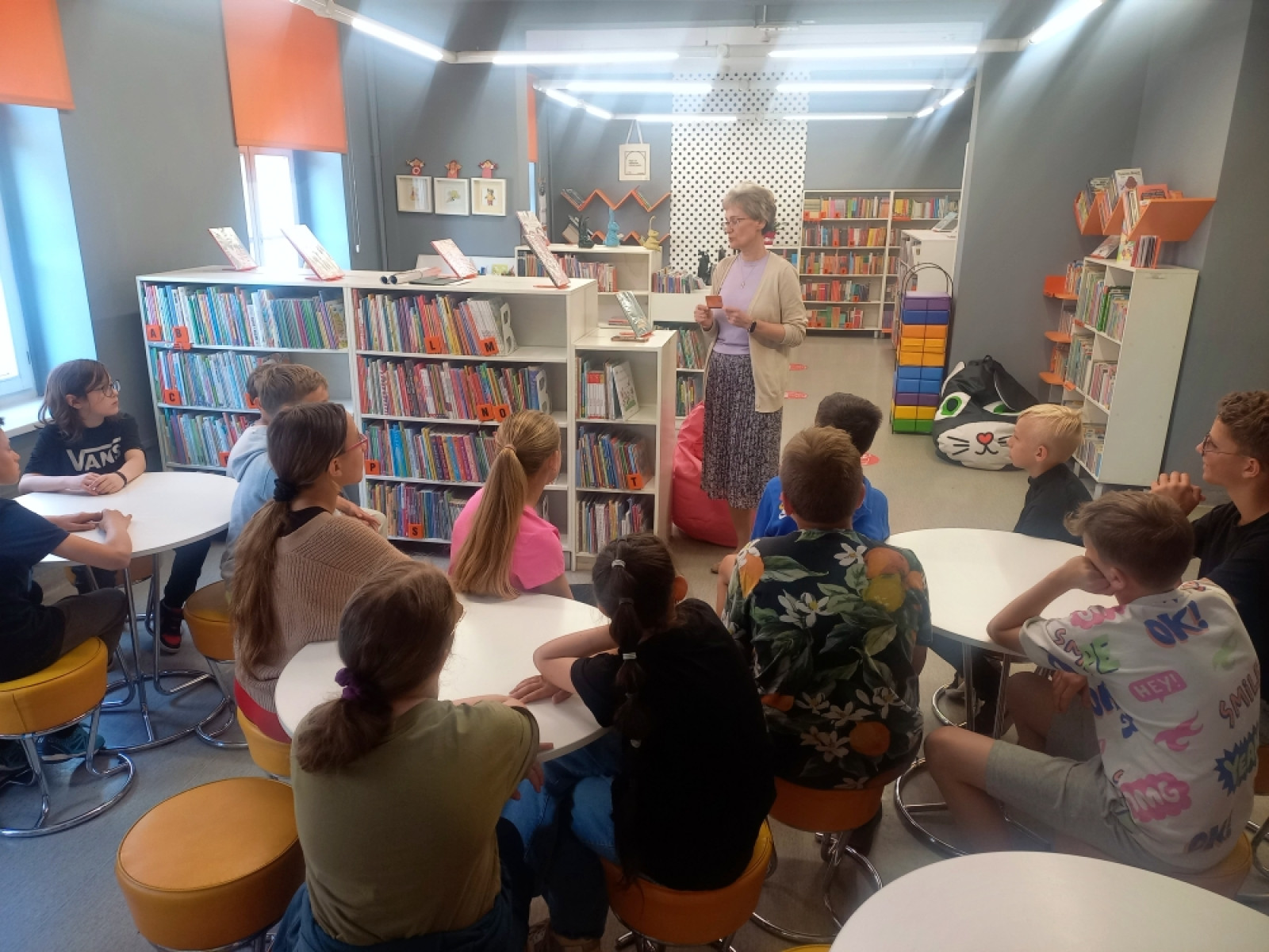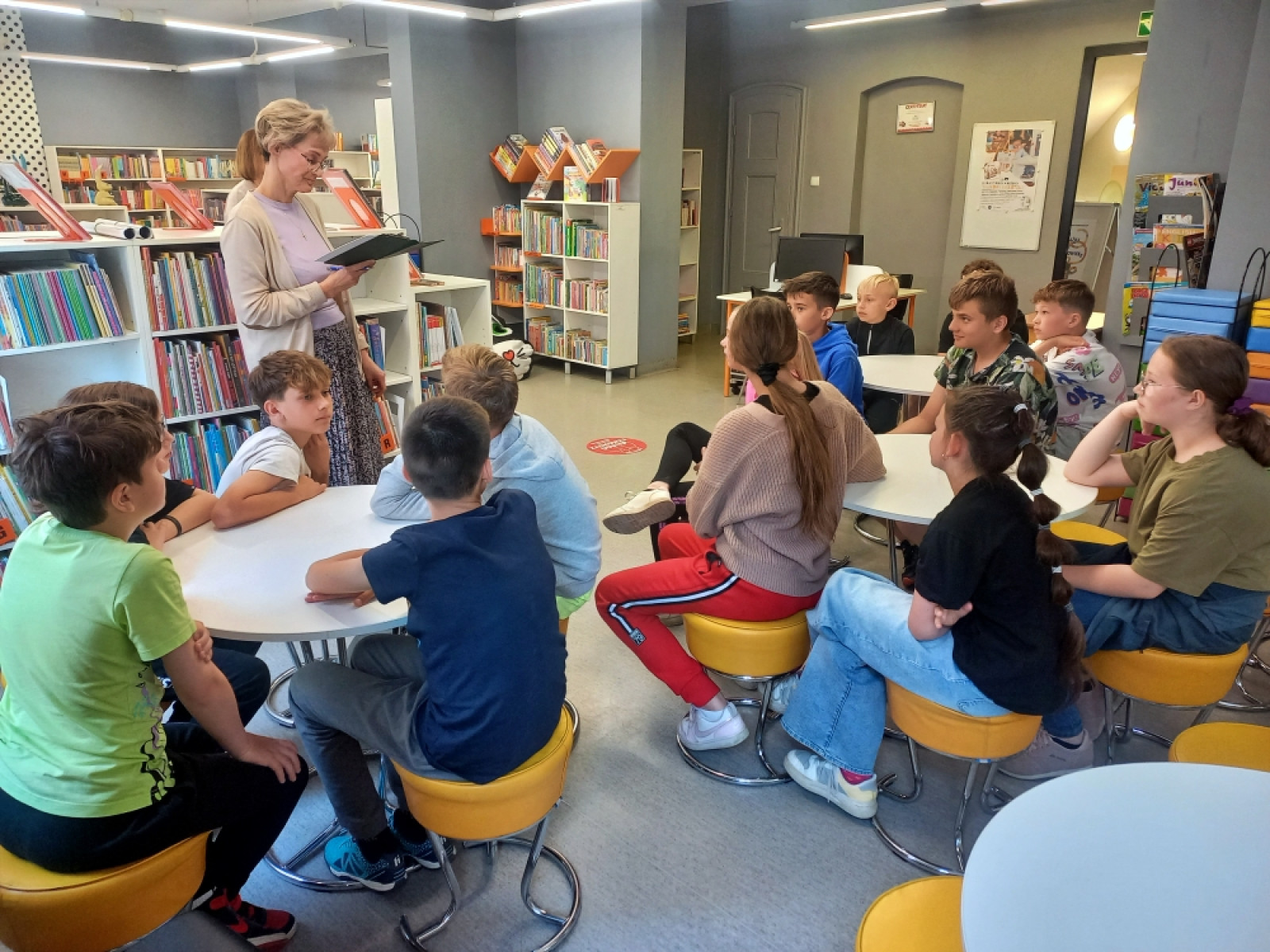 2 Czerwca 2023W słoneczne, środowe przedpołudnie gościliśmy grupę uczniów z klasy piątej razem z polonistką panią Joanną Szymańską- Andrzejczuk. Młodzież rozpoczęła wizytę w bibliotece od podziwiania barwnego muralu, który widnieje na gmachu biblioteki. Później młodzież miała okazję zapoznać się z zasadami regulaminu naszej placówki oraz zwiedzała jej agendy mieszczące się na I piętrze - Bibliotekę dla Dzieci i Młodzieży „Pod Sową”, Wypożyczalnię i Czytelnię oraz podziwiała XII Międzynarodową Wystawę Ekslibrisów i Małych Form Graficznych ”Kwiaty. Poeci Ziemi”.