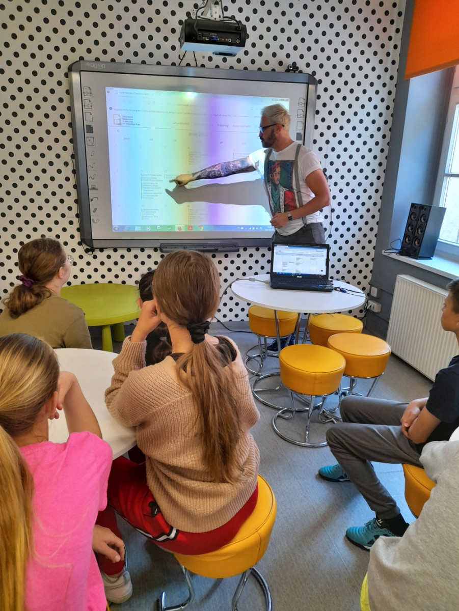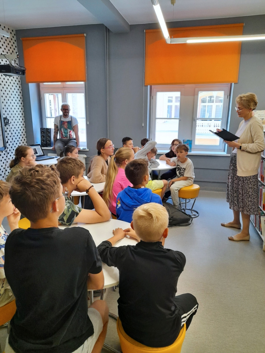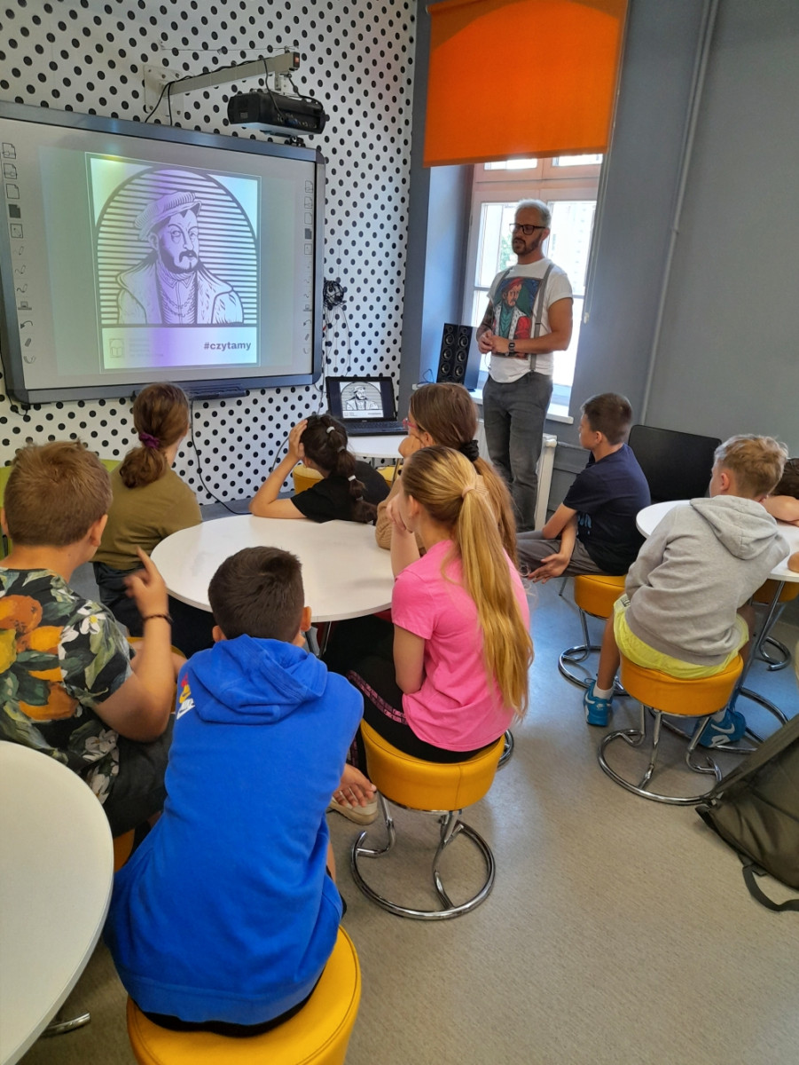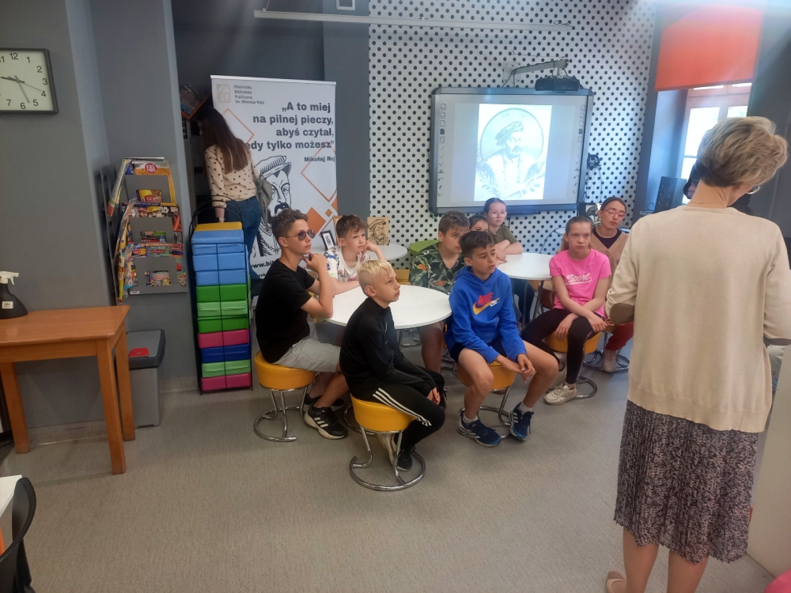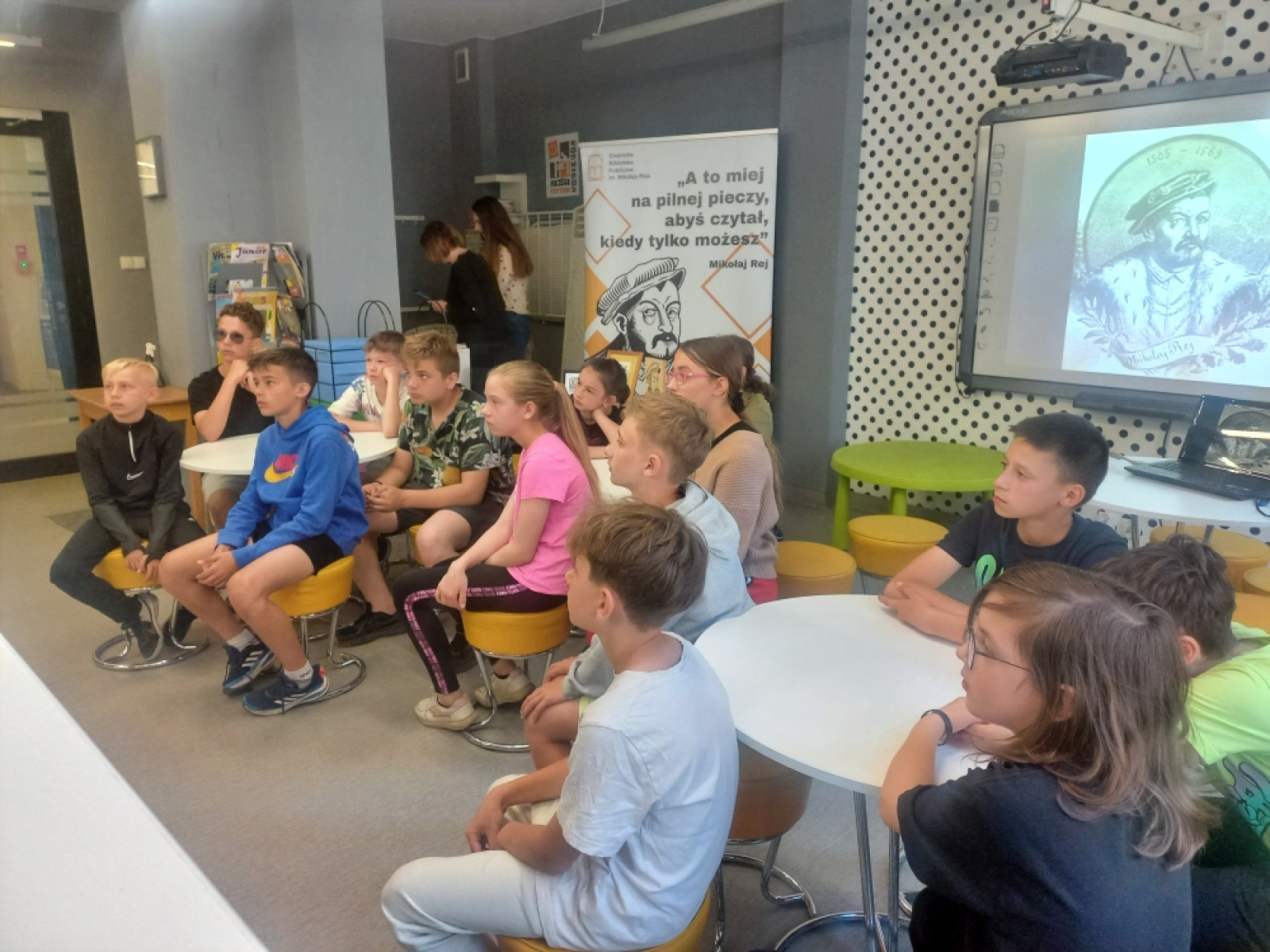 Kolejnym punktem wizyty była prezentacja naszego patrona Mikołaja Reja, bibliotecznej strony internetowej i wydarzeń promujących czytelnictwo organizowanych w bibliotece. Wizytę zakończył quiz wiedzy o naszym patronie Mikołaju Reju, w którym młodzi goście zdobyli maksymalną ilość punktów!