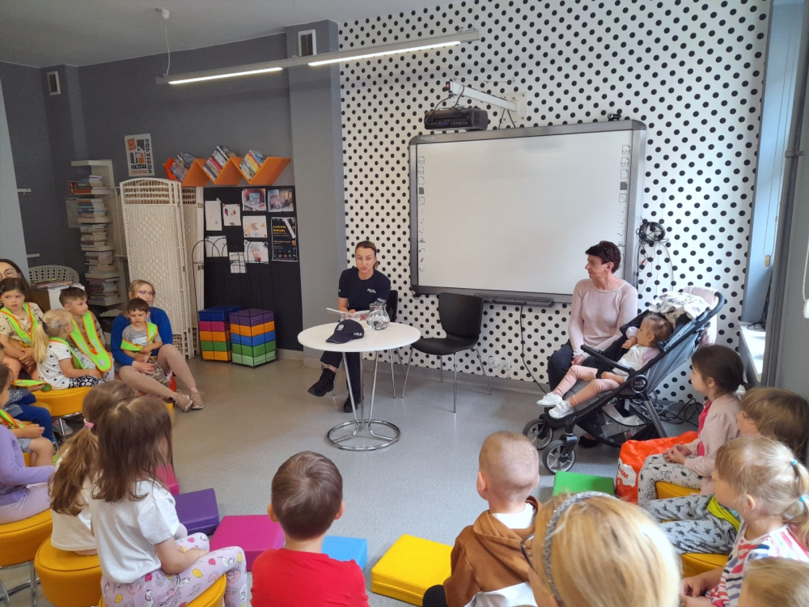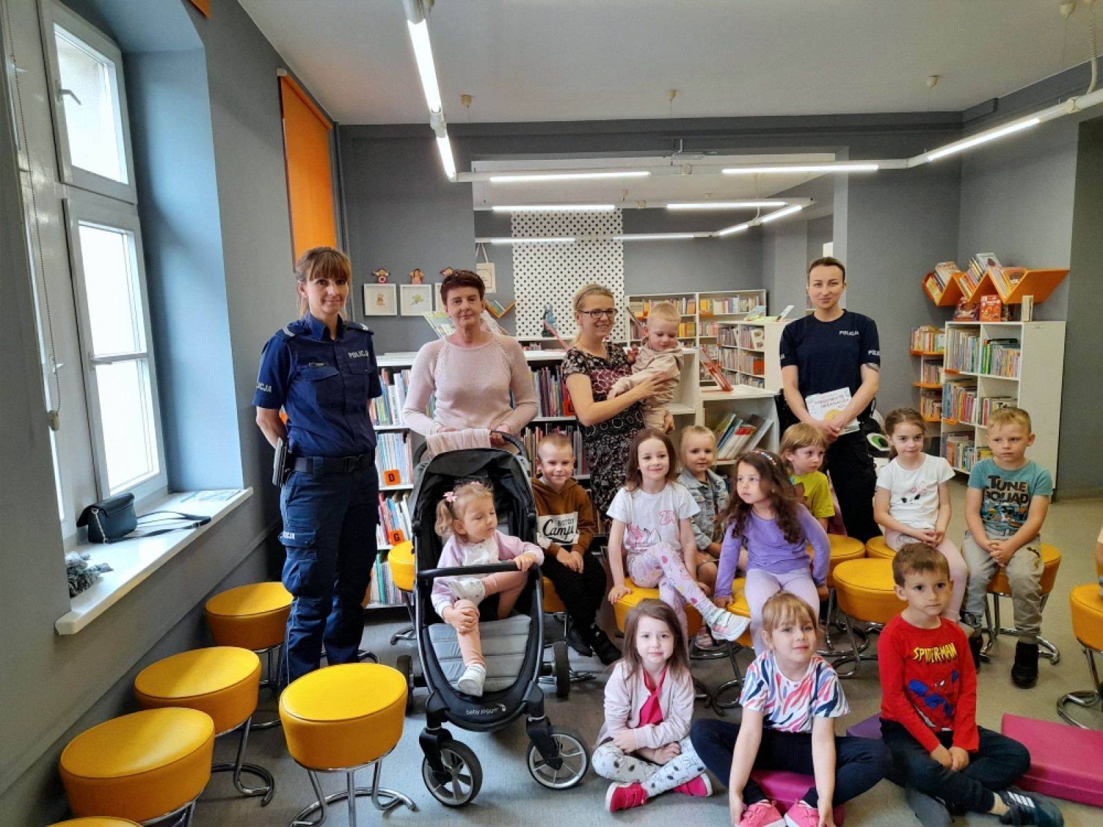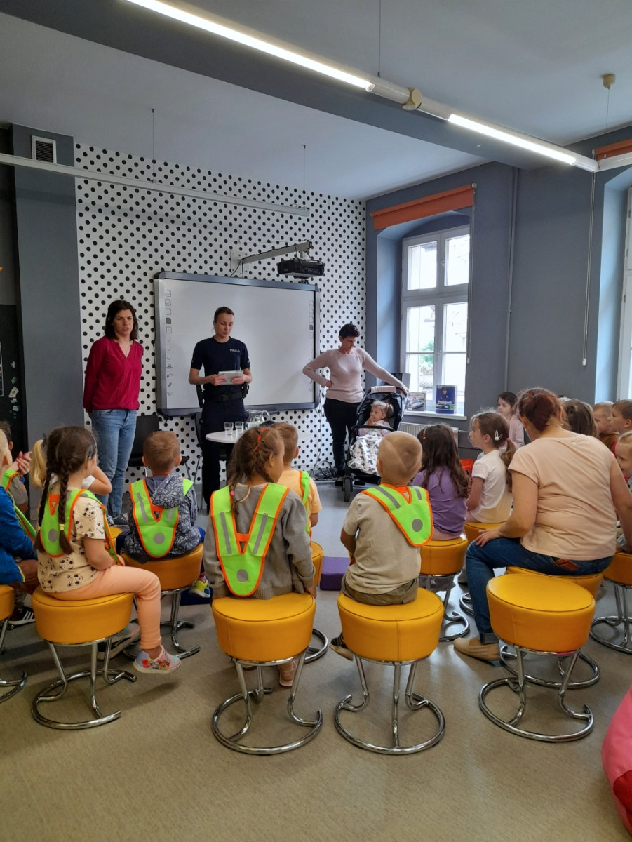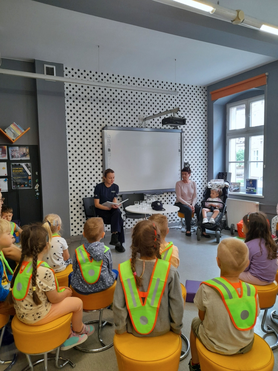 Na kolejne spotkanie w ramach Ogólnopolskiego Tygodnia Czytania Dzieciom zaproszenie przyjęły dzieci z przedszkoli Klub Malucha "Chatka Puchatka" oraz grupa "Biedronki" z Przedszkola "Zielone Ogrody". Gośćmi czytającymi, były Panie policjantki starszy sierżant Karolina Walczak i aspirant Paulina Jaśkowska z Powiatowej Komendy Policji w Oleśnicy. Sympatyczne panie policjantki, oprócz odczytania tekstu "Policjant” Renaty Piątkowskiej, opowiadały o swojej pracy oraz przypomniały zasady bezpiecznego poruszania się pieszo i na rowerze. Nie zabrakło informacji o numerze alarmowym i korzyściach z używania na co dzień elementów odblaskowych .Radosne przedszkolaki przekazały na koniec spotkania pozdrowienia dla ich ulubionego komisarza Lwa.