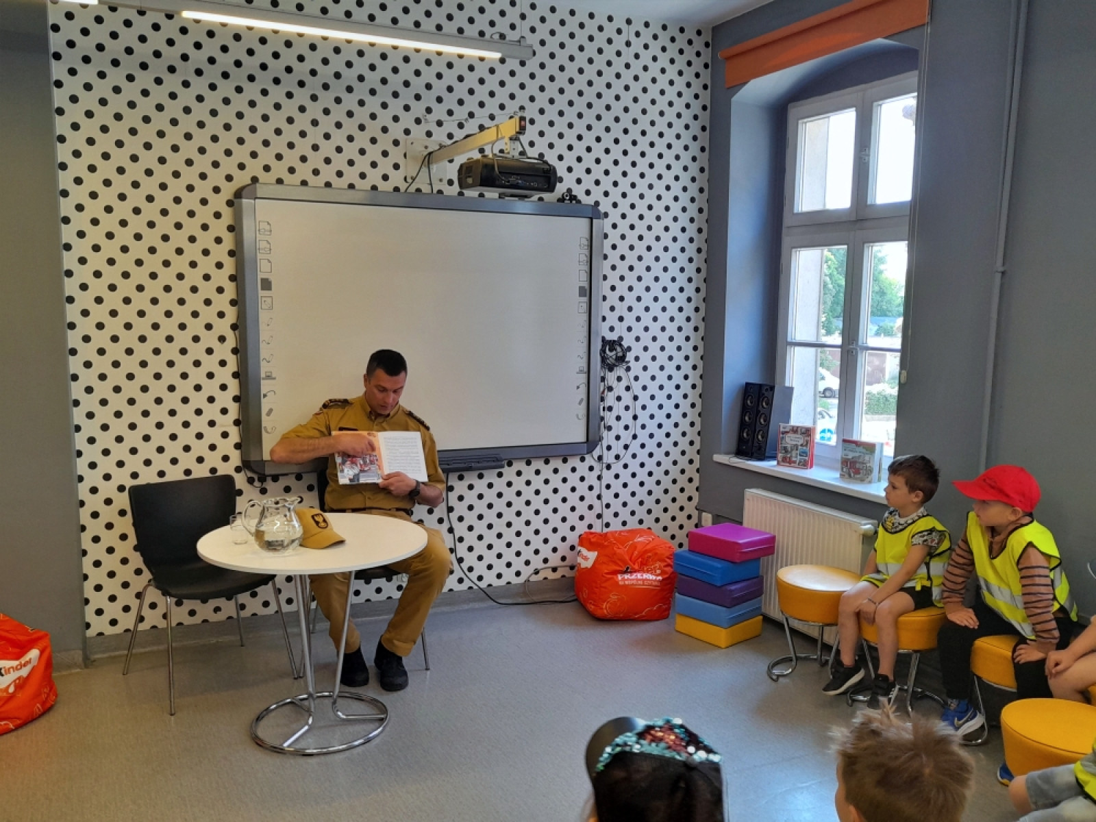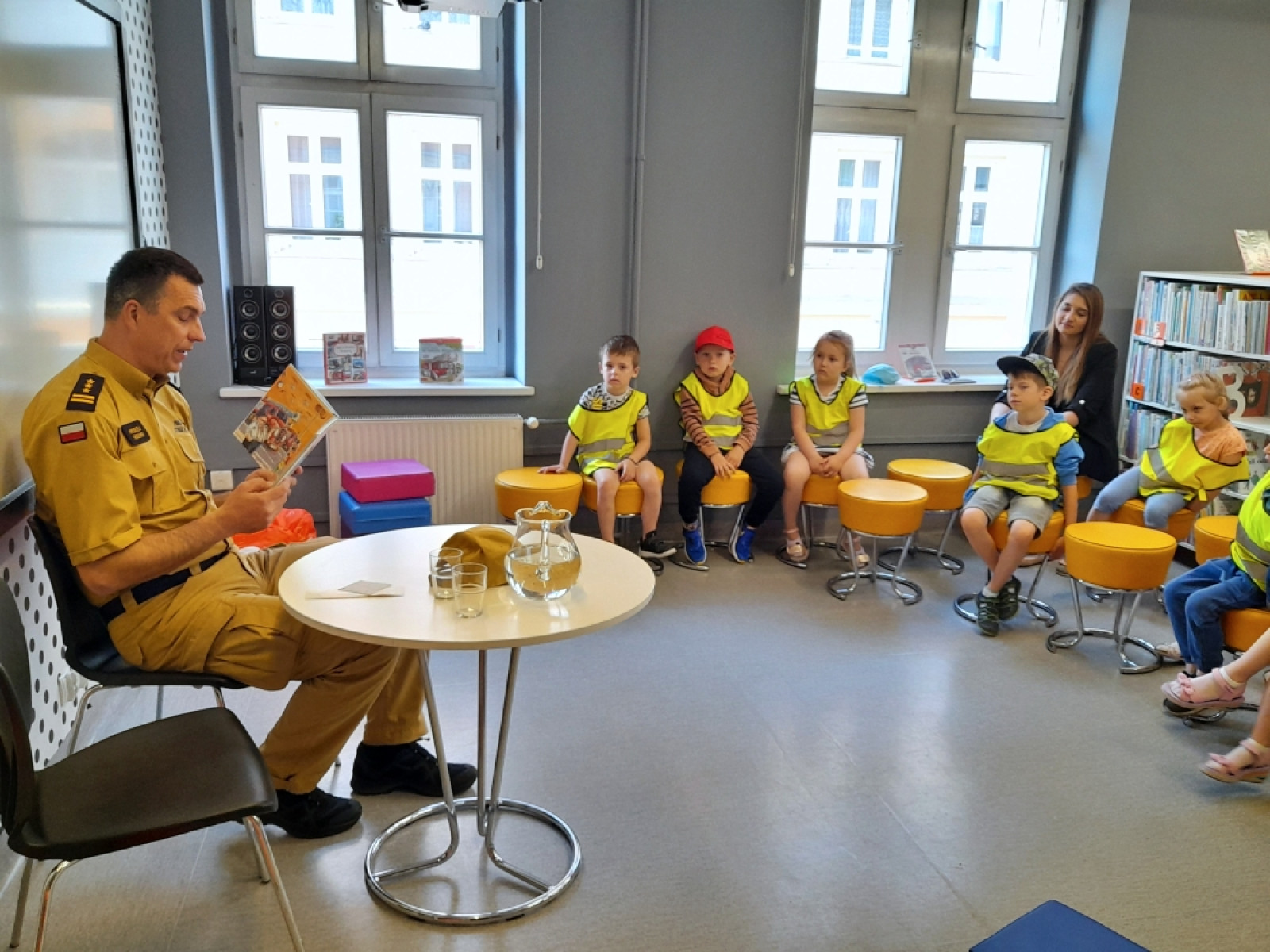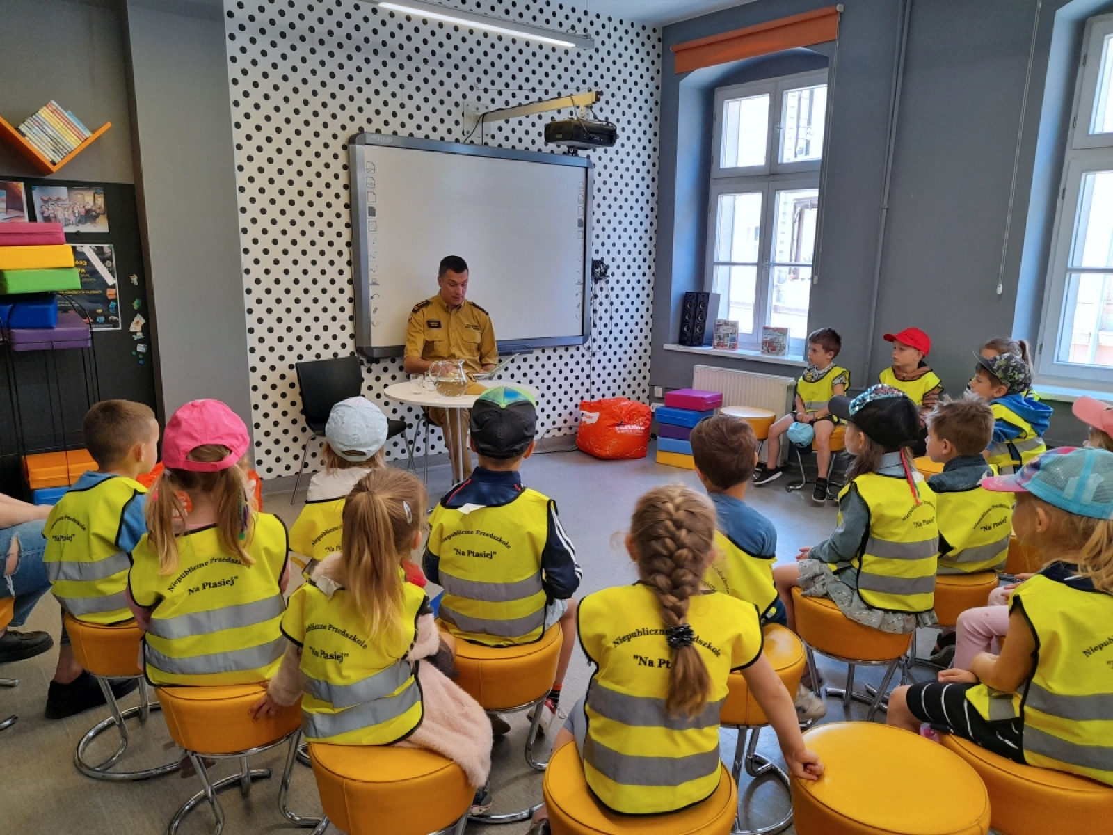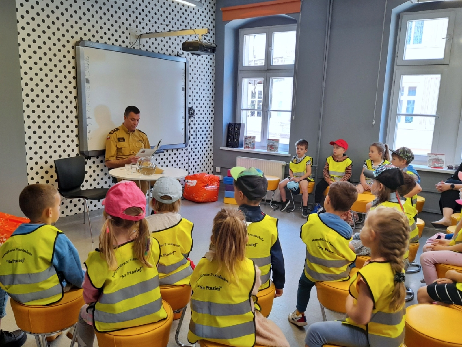 5 czerwca 2023 spotkania czytelnicze w Bibliotece "Pod Sową” w ramach OTCD, rozpoczął pan komendant Powiatowej Komendy Państwowej Straży Pożarnej w Oleśnicy - st. bryg. mgr inż. Andrzej Fischer. Przedszkolaki z grupy „Biedronki" z Przedszkola "Na Ptasiej" wysłuchały odczytanego przez pana strażaka opowiadania Renaty Piątkowskiej - "Strażak". Potem przypomniały sobie w jakich sytuacjach należy wezwać strać pożarną, jaki jest numer alarmowy oraz jak unikać sytuacji zaprószenia ognia. Gość spotkania opowiadał o sprzęcie jakim posługują się strażacy oraz o sytuacjach w jakich ich pomoc jest niezbędna.