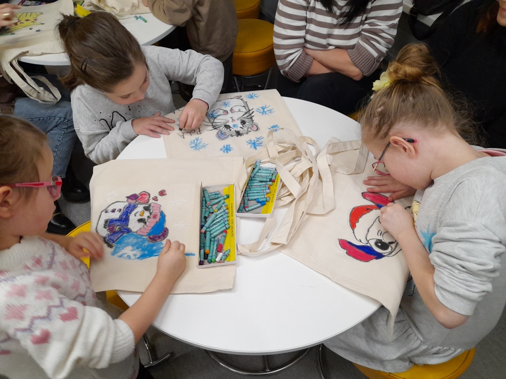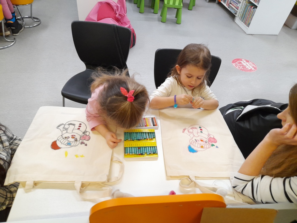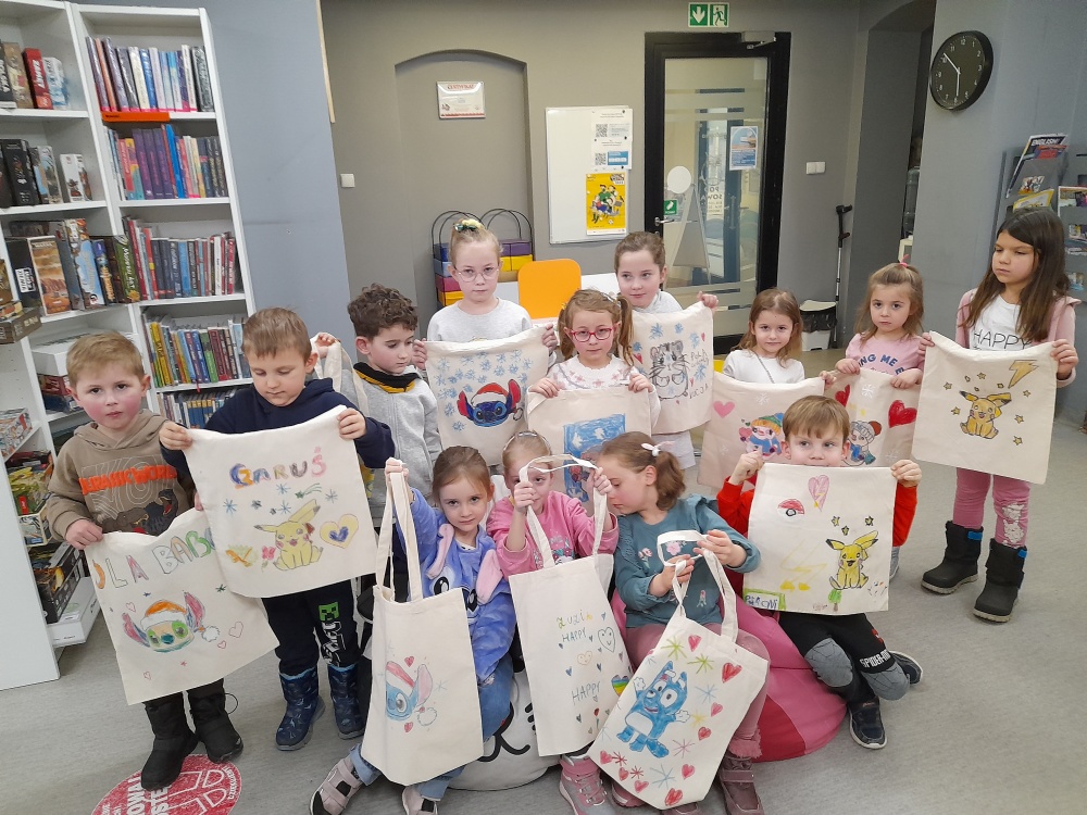 Dzieci wysłuchały opowiadania Yuvala Zommera "Co to jest ten śnieg?", a następnie chętnie opowiadały o swoich ulubionych zimowych aktywnościach. Po części literackiej przyszedł czas na pracę plastyczną - zadaniem Jeżyków było ozdobienie bawełnianych toreb. Uczestnicy wykorzystali szablony z postaciami ulubionych bajek, które przenieśli na torby i ozdobili według własnych pomysłów.
