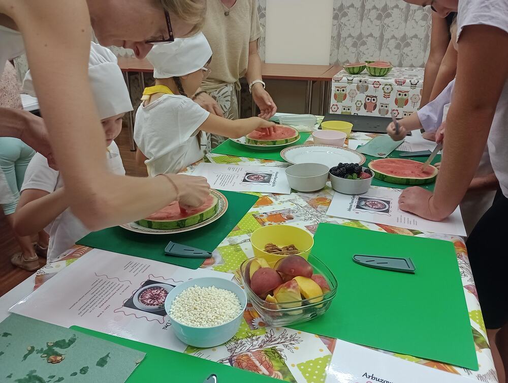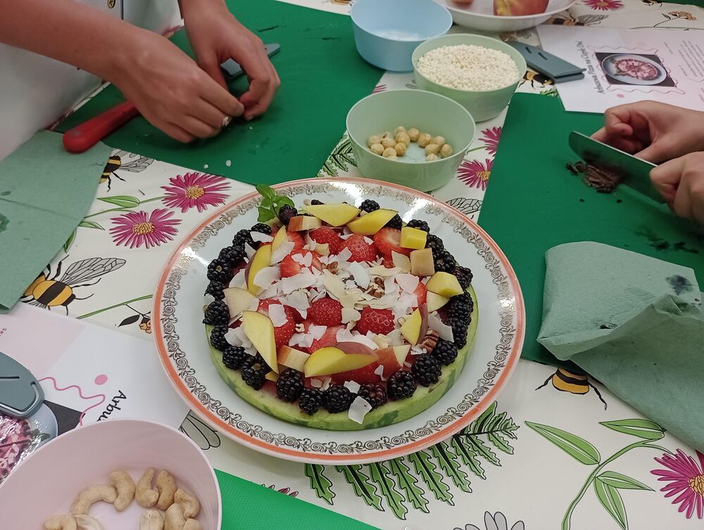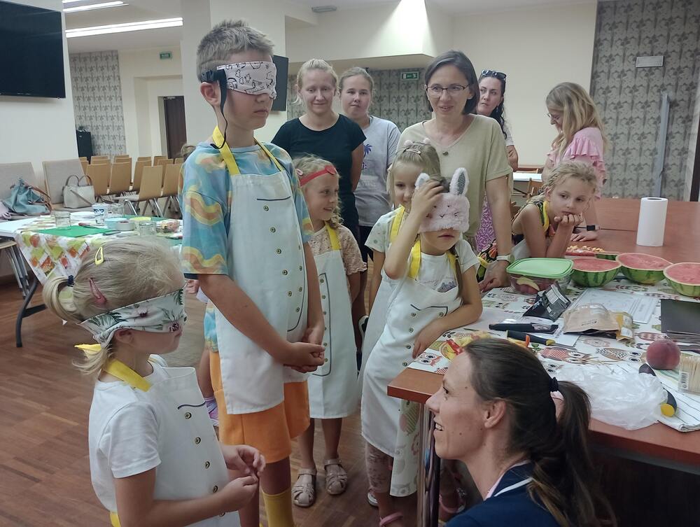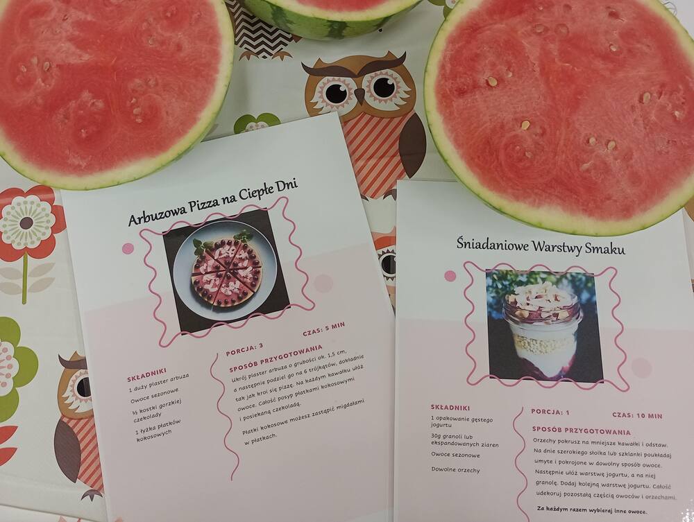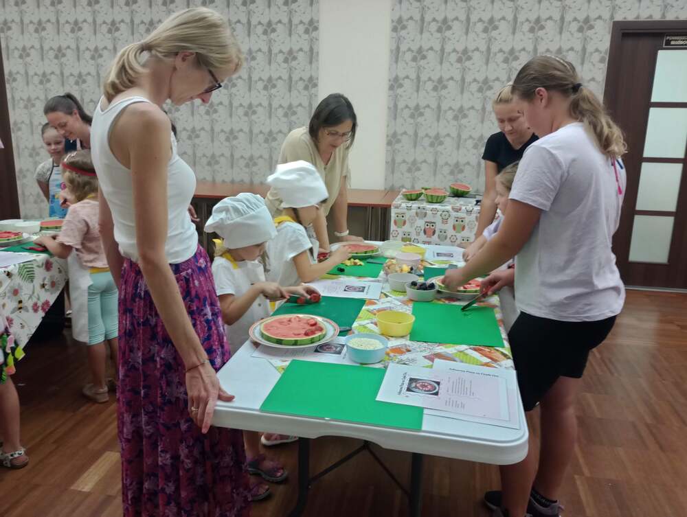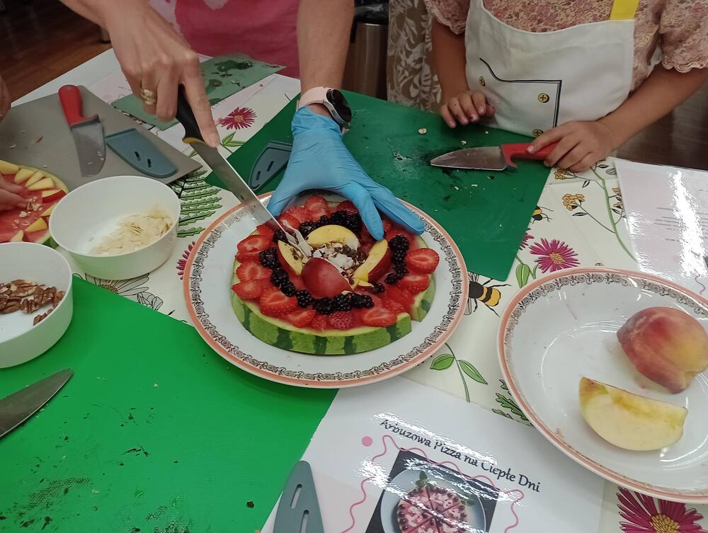 19 Lipca 2024Kolejne warsztaty "Gotuj zdrowo z Sową" były okazją do wypróbowania dań na letnie, ciepłe dni. Latem, kiedy wysokie temperatury obciążają nasz organizm, przyjemnie schrupać coś lekkiego i jednocześnie nawadniającego. Taką potrawą jest "arbuzowa pizza", którą grupa małych kuchcików przygotowała z wielką fantazją i dbałością o szczegóły, pod okiem pani dietetyk Beaty Papierz.