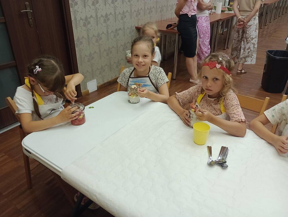 Podobnie było przy kolejnej zdrowej propozycji - "śniadaniowych warstwach smaku", gdzie królował jogurt naturalny i oczywiście owoce sezonowe w towarzystwie orzechów. Oba dania stanowiły dla uczestników warsztatów pełnowartościowy podwieczorek. Życzymy, aby odżywcze receptury przetestowane podczas warsztatów wzbogacały rodzinny jadłospis nie tylko latem.